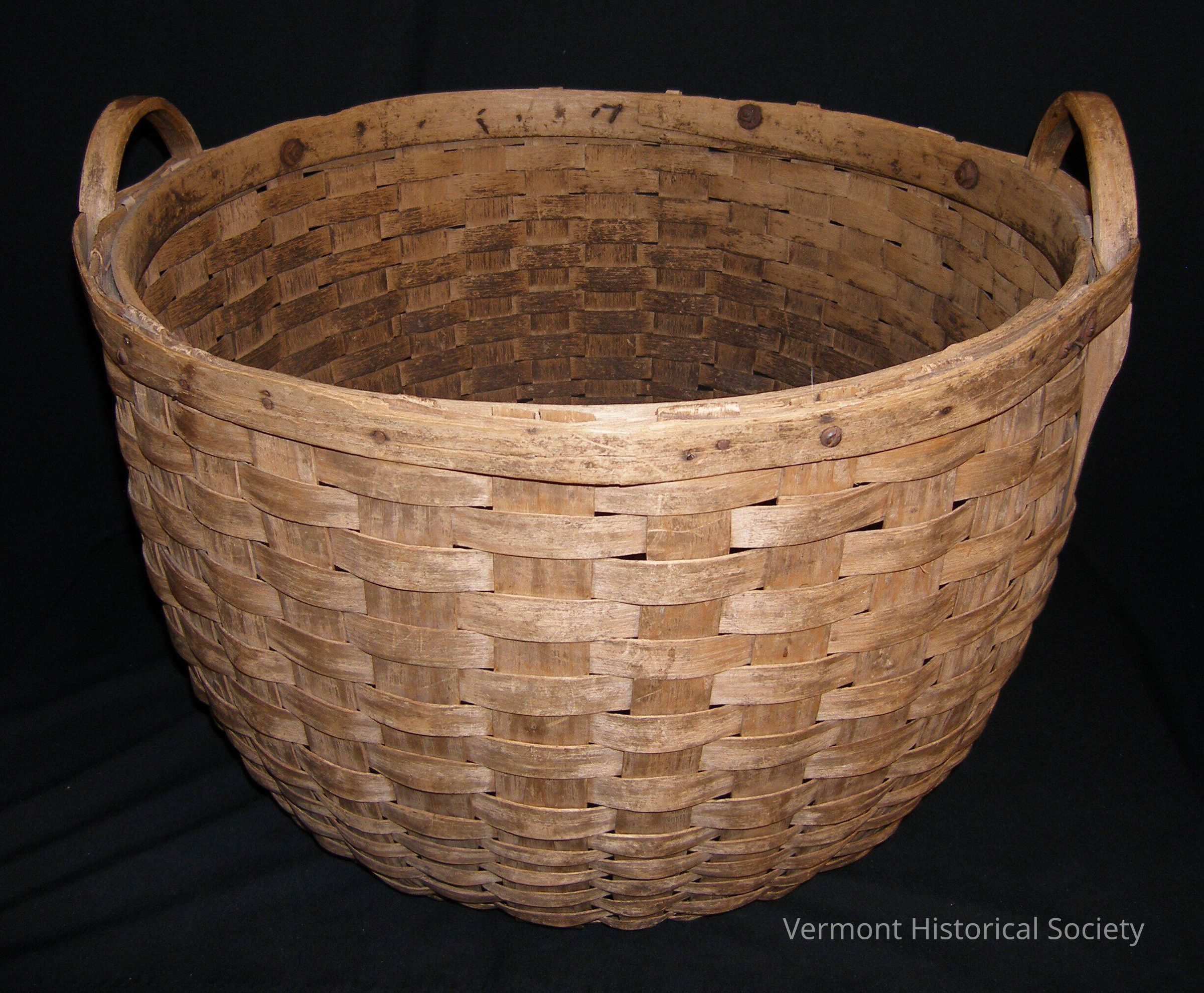 Large basket with Sweetser-style bottom. The basket is woven of wooden splints, and the top edge is reinforced with nailed-on splits at both the exterior and interior. There are two U-shaped handles on either side of the rim.Context