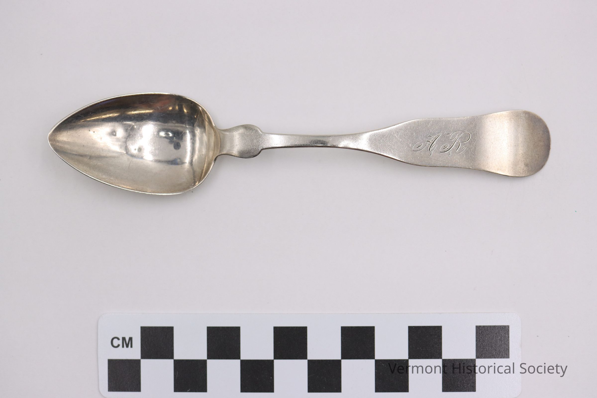 Silver teaspoon with round shoulder and downturned fiddle handle. The handle is engraved with the initials "A.R." The back of the handle is marked, "R. H. BAILEY."