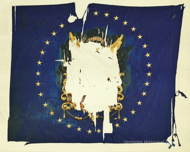 10th Vermont Infantry regimental flag. Attached to staff by ties. There are 34 gold painted stars arranged in a large circle, 4.5 inches on center. Center seal is missing.