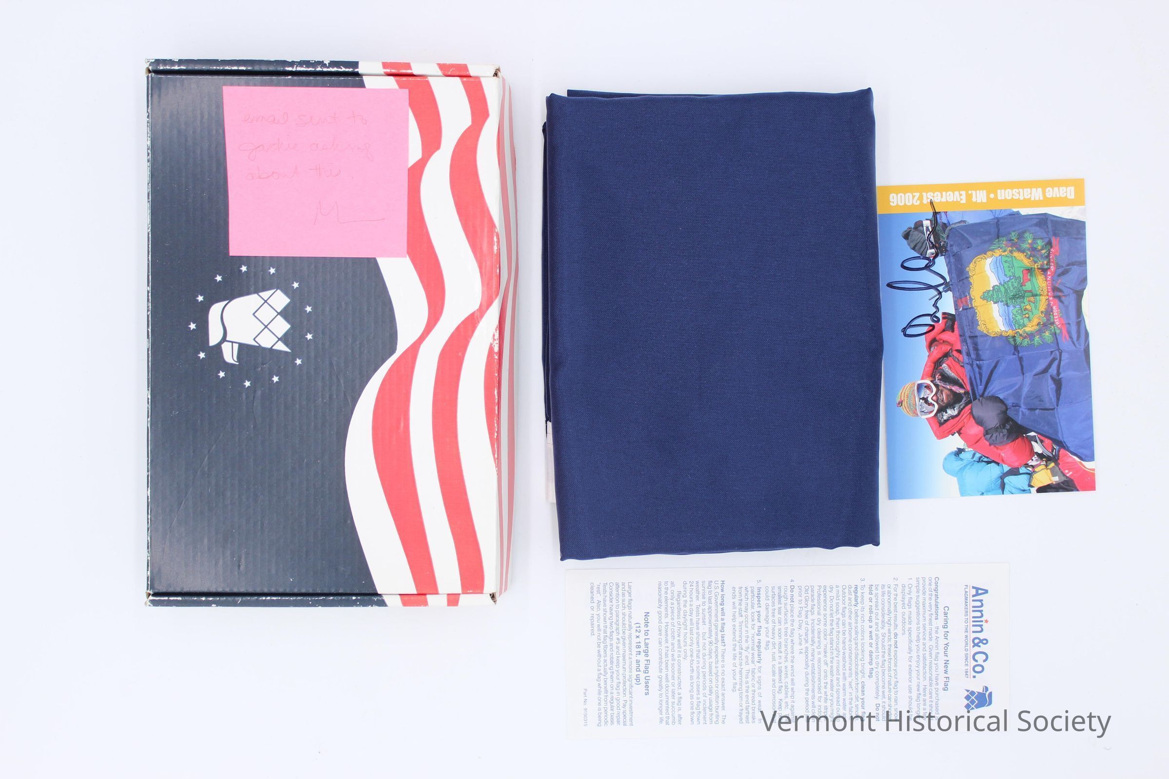 Vermont state flag contained in its original box with two archival objects: an autographed postcard showing a man (Dave Watson) holding the flag and a side banner indicating that it was on Mt. Everest; and a paper indicating how to care for the flag.