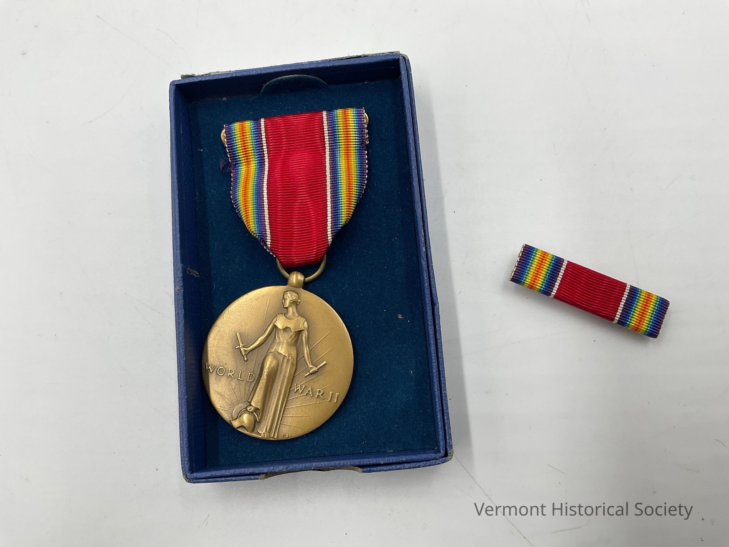 A pin that consists of a red, blue, yellow and white ribbon with a gold-colored medal hanging below and a similar ribbon affixed to a metal bar pin. These are WWII victory emblems awarded to those who served in the military between 1941 and 1946.Context
