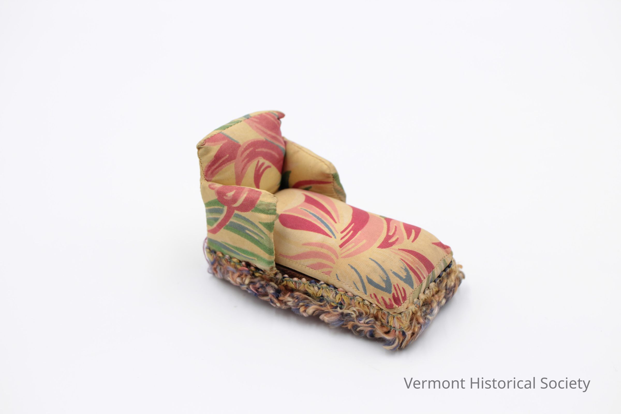 Miniature, upholstered chaise longue sized for a dollhouse. The lounge consists of a long seat with two arms and a padded back. It is covered with yellow fabric printed with large-formate flowers in pink, blue, and green. There is multi-colored fringe around the base.Context