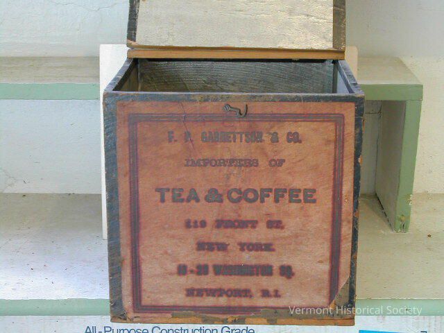 Paper-lined wooden box with lid. A paper label on the front reads, "F.P. GARRETTSON & CO. IMPORTERS OF TEA & COFFEE 119 FRONT STREET 16-20 WASHINGTON SQUARE NEWPORT, R.I."