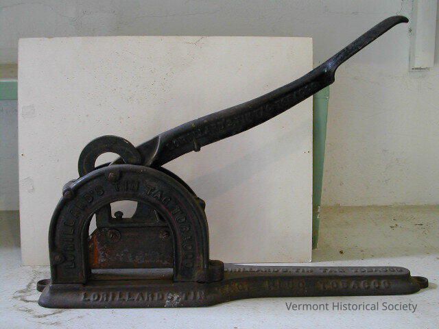 Cast-iron tobacco cutter consisting of a long base and handle. The handle connects to the base between two U-shaped brackets; when pressed down, the handle closes a large metal blade against the base. The bracket is molded with the inscription, "LORILLARD'S TIN TAG TOBACCO". The base and handle are also molded with the same inscription in 6 more places.Context