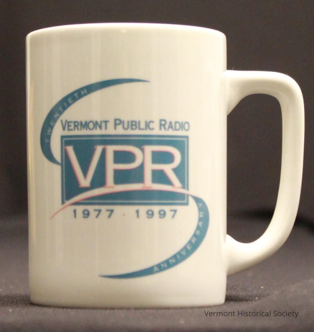Straight-sided white ceramic mug with the inscription "VERMONT PUBLIC RADIO VPR 1977 - 1997 / TWENTIETH ANNIVERSARY" on both sides.