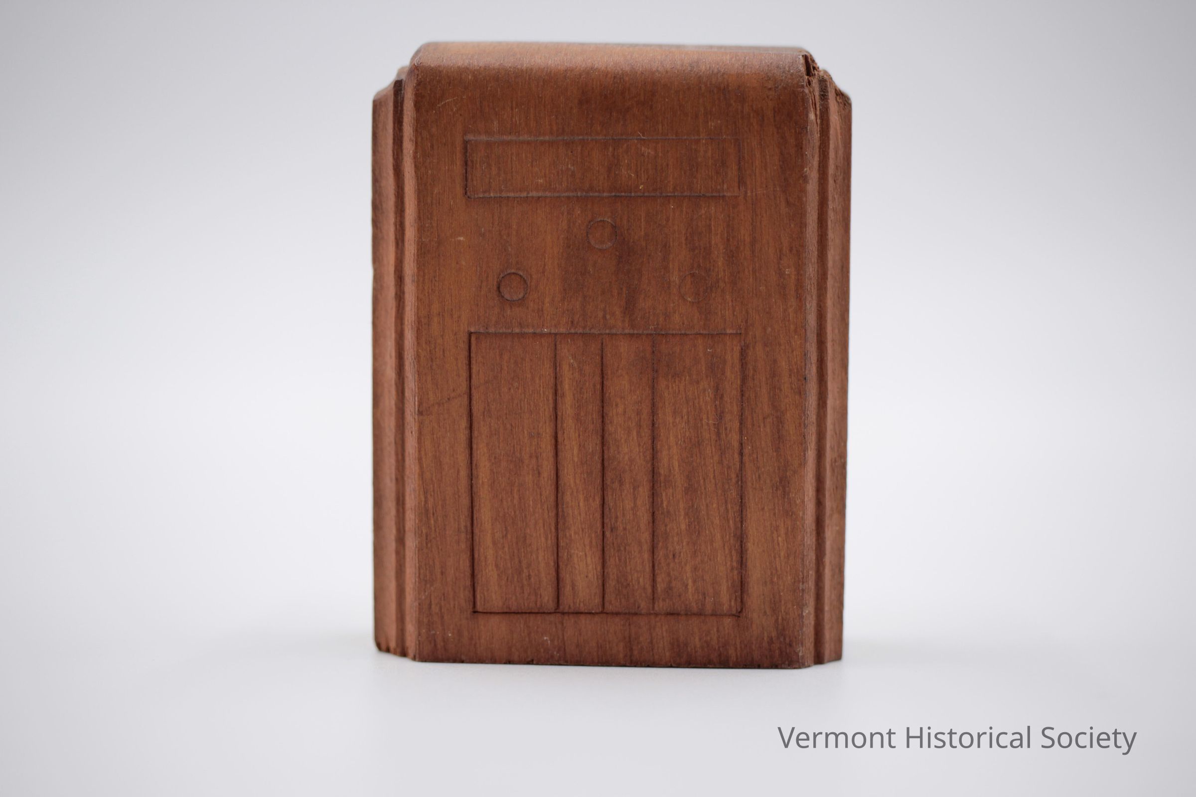 Miniature wooden radio carved from a single block of wood. The sides are stepped, and the front is pressed with rectangles and circles to imitate knobs, dials, and speakers.Context