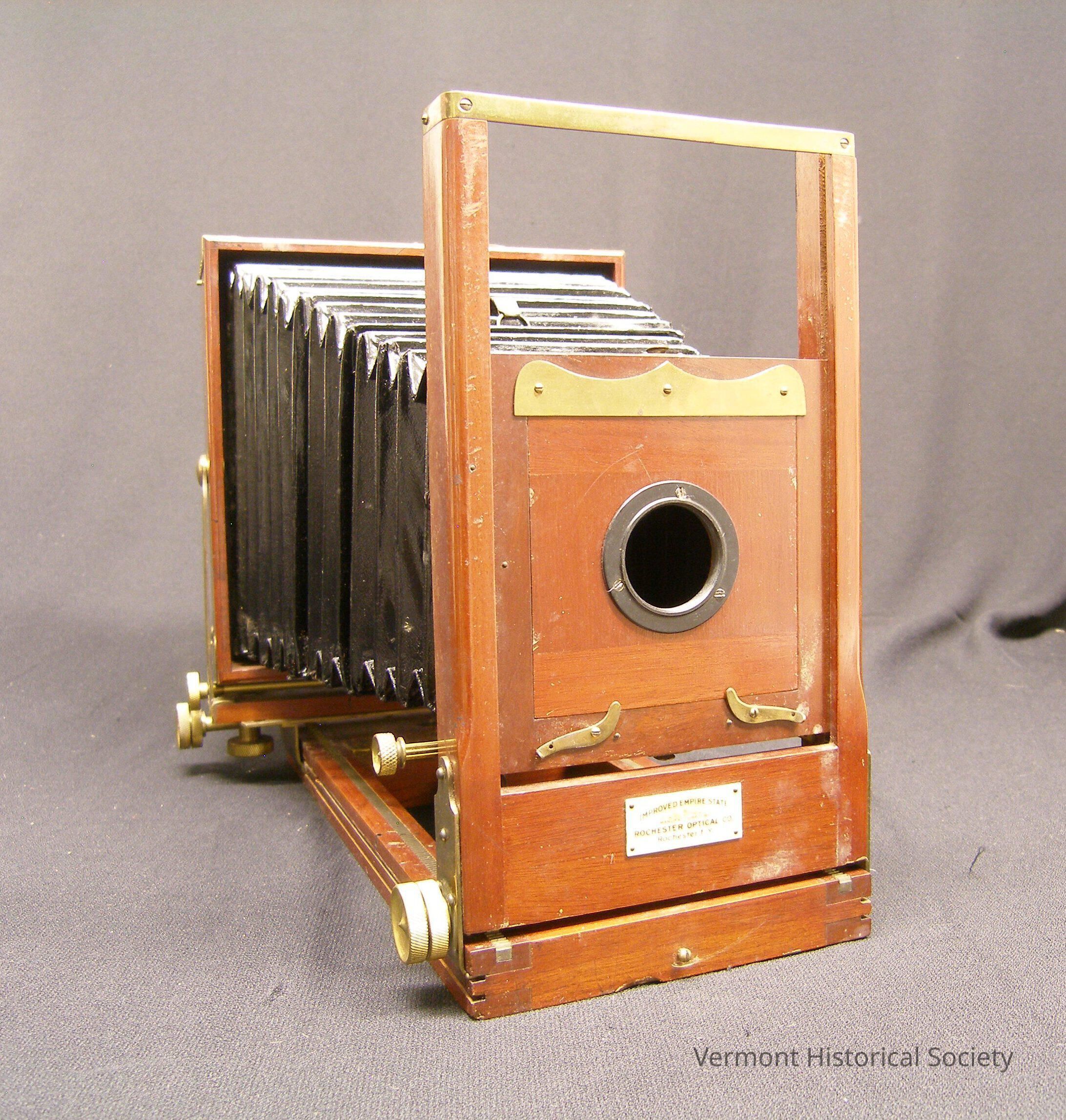 Glass plate camera that folds into a box. When folded, the camera slides into a small carrying case. The back side detaches at both the top and the bottom with metal protrusions that slide into clasps. Additionally, a hinged door is placed in the center of the back piece allowing access to the glass plate. Once open, the lens and its attached leather bellows can be slid onto an extendable wooden track. A small plaque under the lens bears in the inscription, "IMPROVED EMPIRE STATE MANUFACTURED BY ROCHESTER OPTICAL CO. Rochester, N.Y."Context