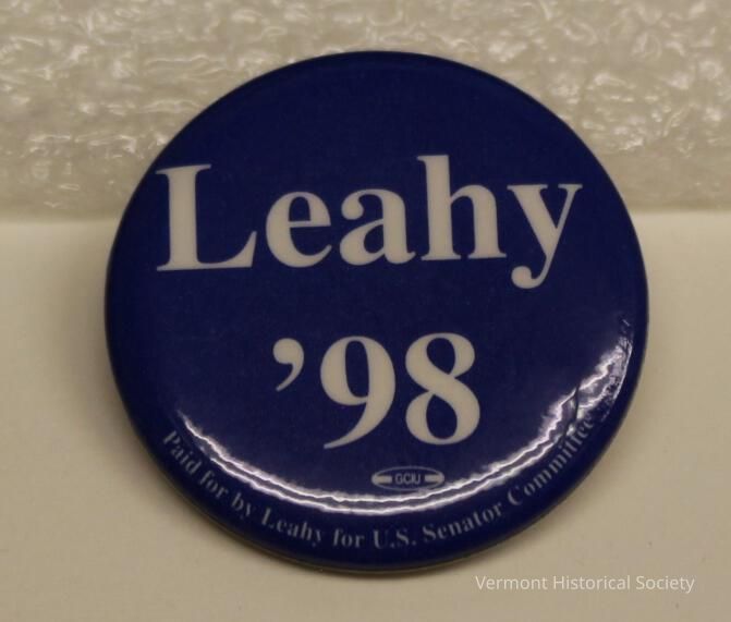 Round, blue metal button with the white inscription, “Leahy ‘98”. Along the bottom edge is a small, white inscription reading, "Paid for by Leahy for U.S. Senator Committee."