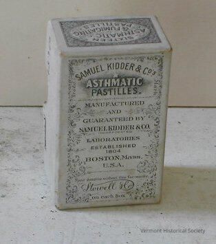 Small rectangular shaped, grey colored box that reads, "Samuel Kidder & Co. Asthmatic Pastilles. Manufactured and Guaranteed by Samuel Kidder & Co. Incorporated Laboratories Established 1804 BOSTON, Mass. U.S.A. " The short sides of the box read, "Sixteen Asthmatic & Fumigating Pastilles"Context