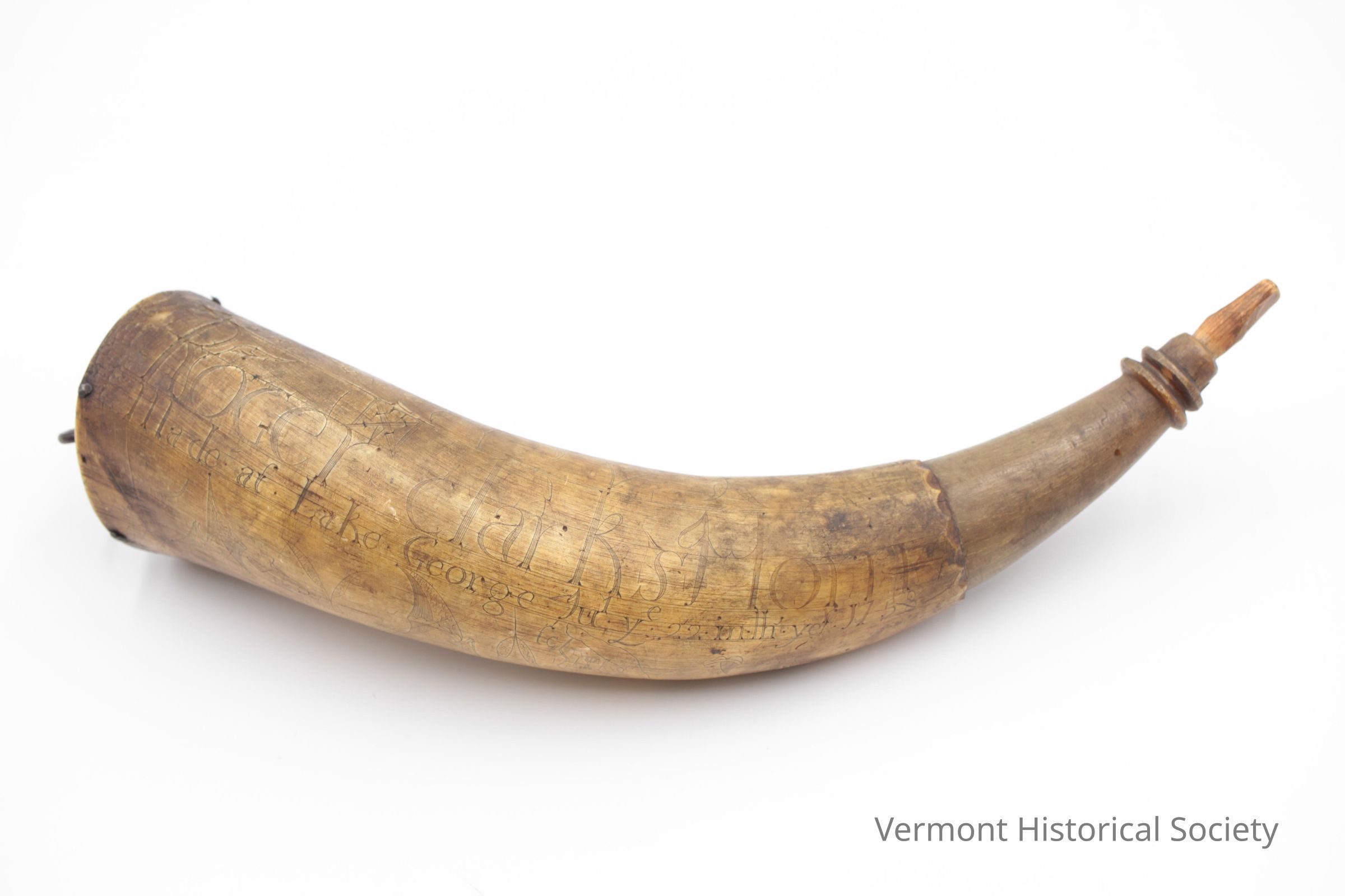Powder horn inscribed, "Roger Clarks Horn Made at Lake George Jul ye 22 in the yer 1758." along with a map of Lake George and Champlain, showing the location of Fort William Henry and Fort Carillon. The end has a wooden plug with an elongated oval metal ring place in the center. The point was cut down to the dark horn below the yellow surface.