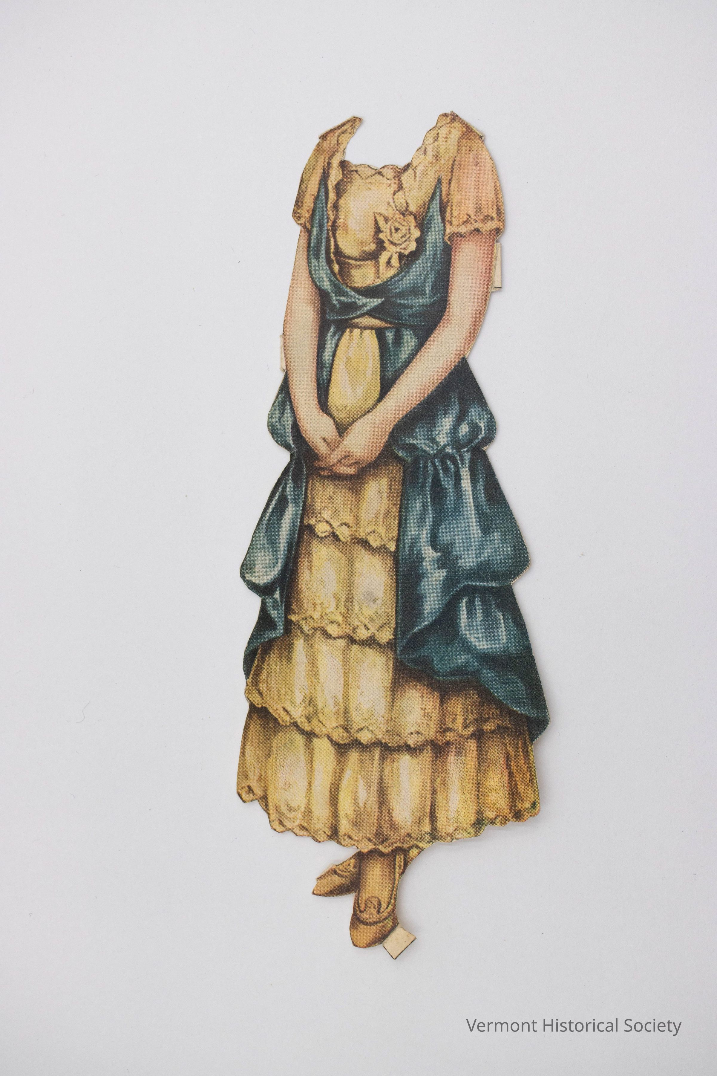 Blue and yellow Edwardian dress for a paper doll. The pink-skinned arms are bare and clasped in the front. The back shows a portion of a sales catalog page.Context
