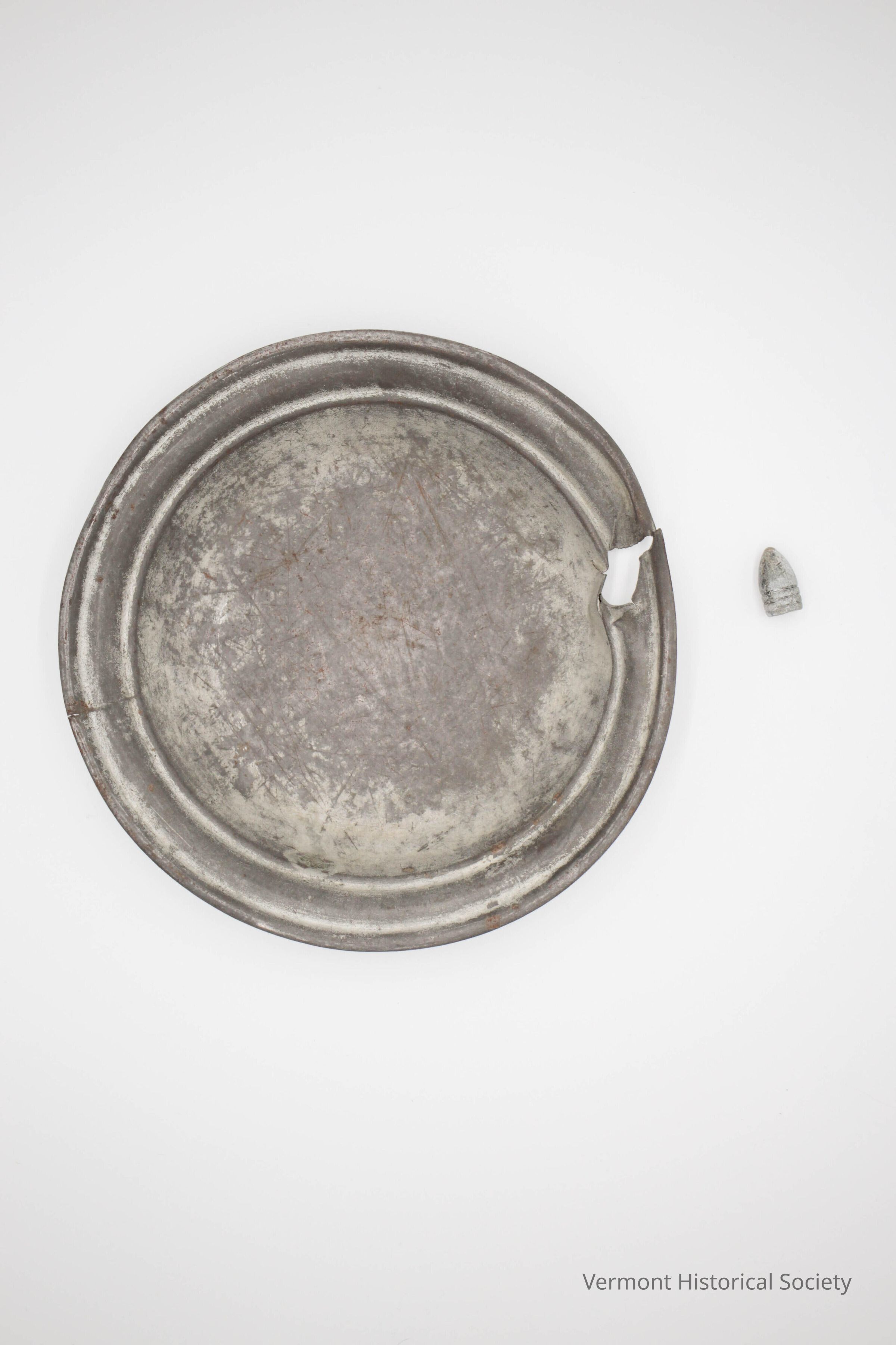 This plate was in the haversack of Cpl. Joseph W. Hitchcock of Co. G., 13th Vermont Volunteers. On the last day of the Battle of Gettysburg (July 3, 1863), he was shot in the leg through the plate. The bullet remained in his leg for nearly four years. When it finally came near the surface, he removed it himself with a jack-knife.