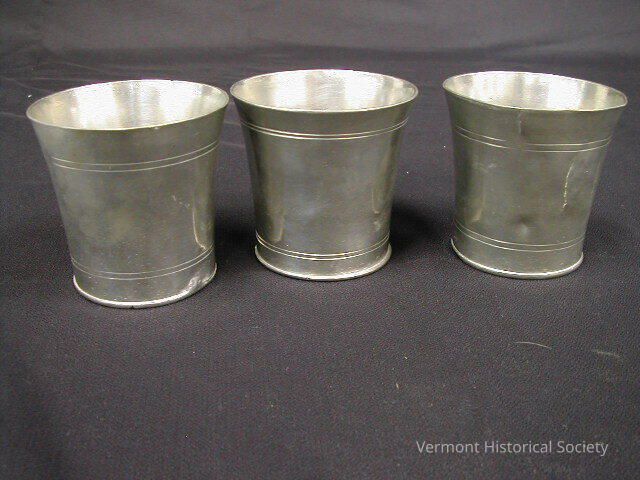 Three pewter beakers with incised rings near top and bottom.
