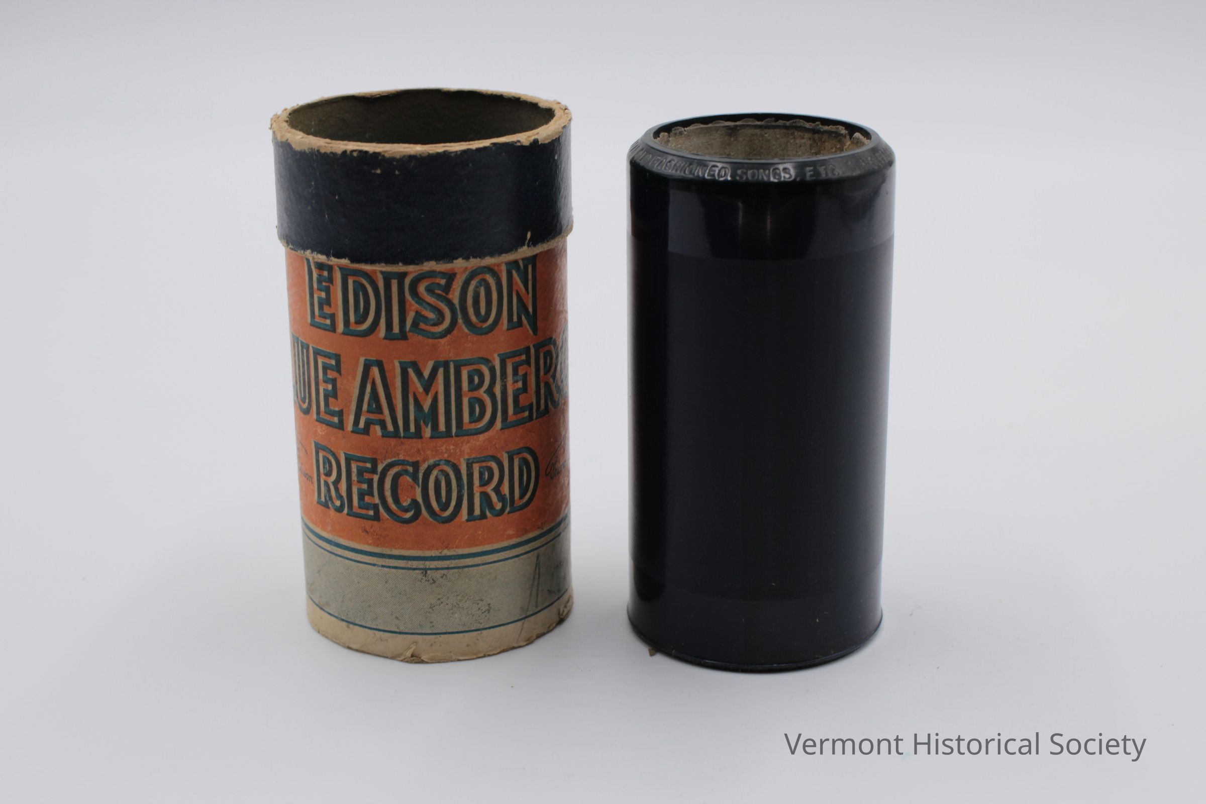 The cylinder is accompanied by a cardboard case with a top lid. The case is labeled on one side with the words, "EDISON BLUE AMBEROL RECORD", in blue on an orange ground. The other side is printed with a photographic portrait of Thomas Edison above the patent and trademark information and the price (60 cents). The central portion of the lid is missing.Use