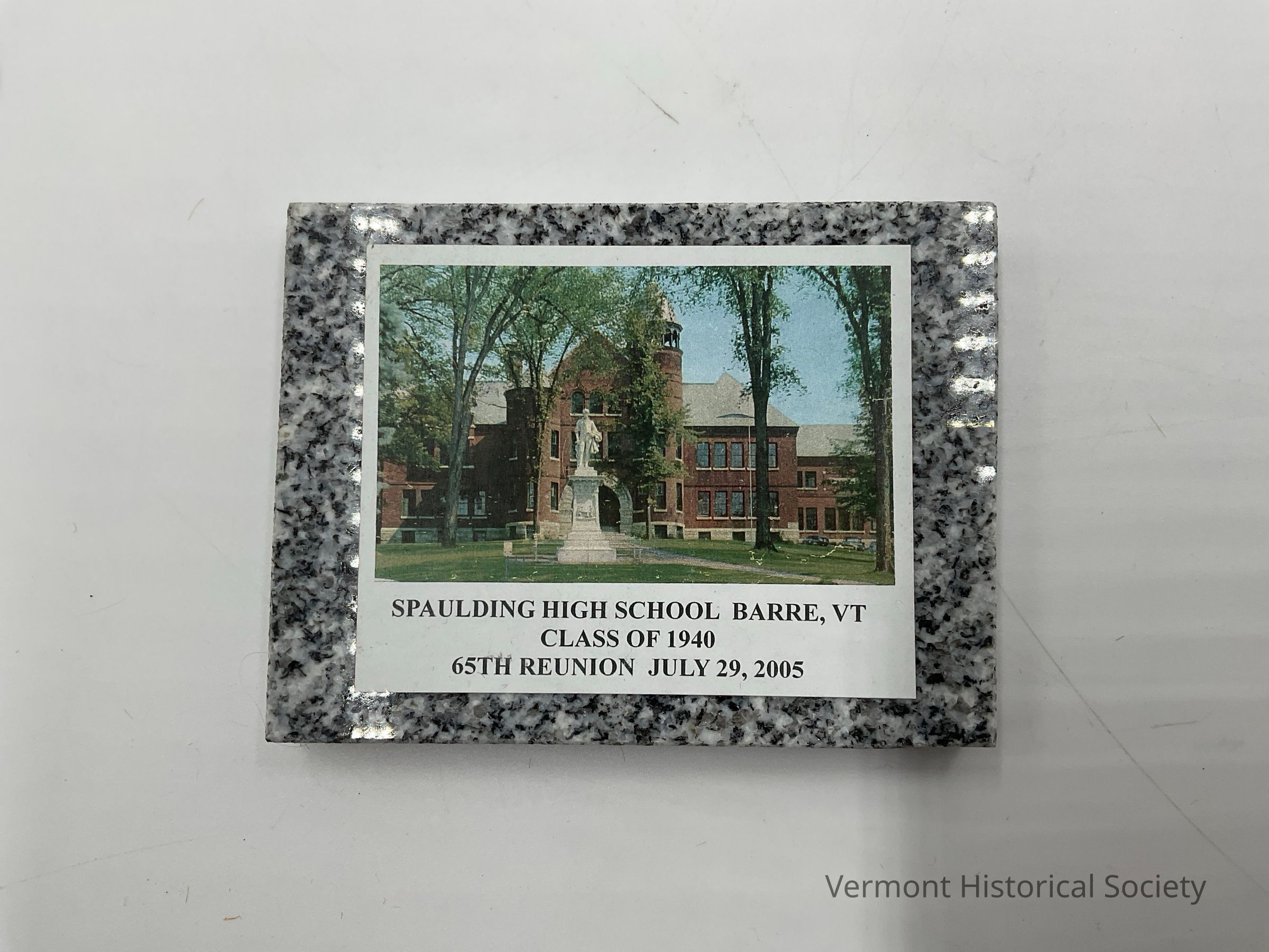 Rectangular granite paperweight with a paper image of Spaulding High School glued to the top. The photograph is captioned: "Spaulding High School, Barre, VT, Class of 1940, 65th Reunion July 29, 2005."Acquisition