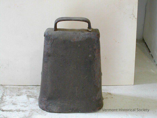 Large rectangular bell with a U-shaped handle at the top. The bell is formed from a flat piece of metal bent to shape and riveted together on the sides.