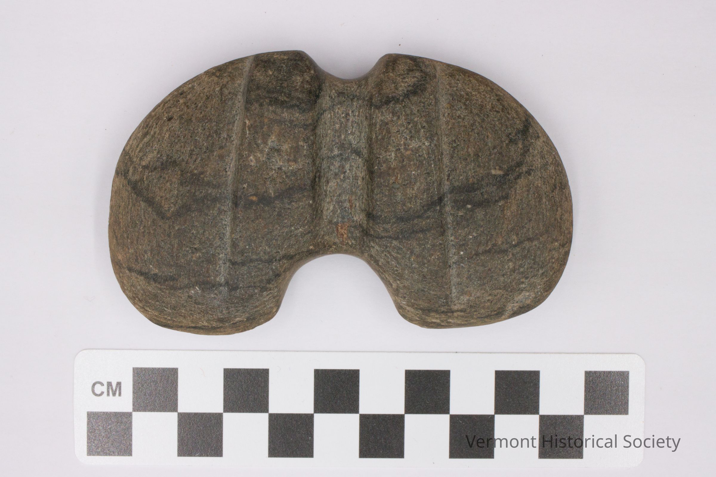 Ground stone double-winged bannerstone with a central groove on both faces. There are shallower grooves running parallel to the central groove on either side.