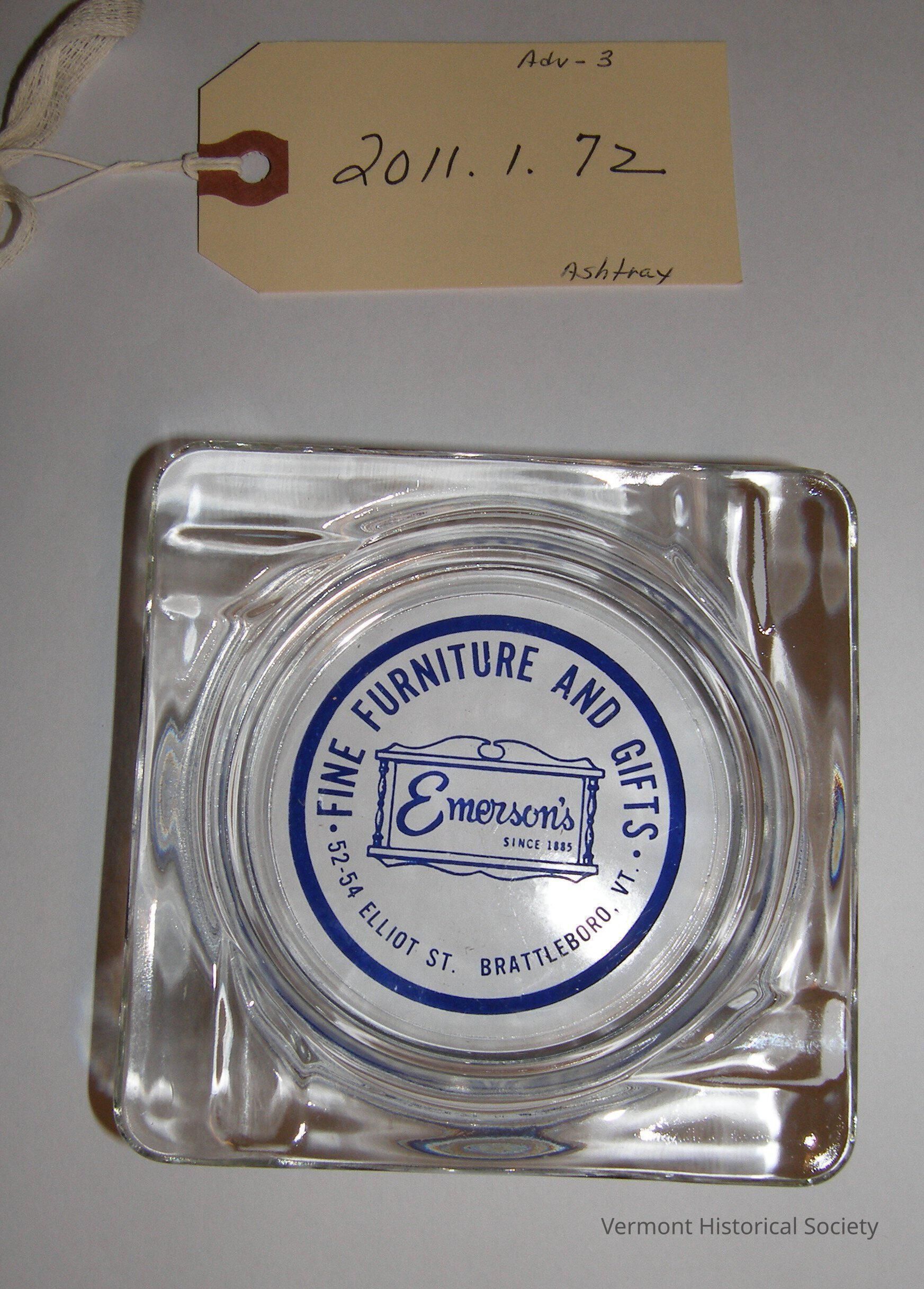 This is a square ashtray made of clear glass, with a circular bottom. Inside the bottom of the ashtray, there is blue lettering that reads "Emerson's since 1885". Above the lettering, there is additional text printed in blue that reads "FINE FURNITURE AND GIFTS". Below the lettering, there is the address of the store , which is "52-54 ELLIOT ST. BRATTLEBORO, VT".Context