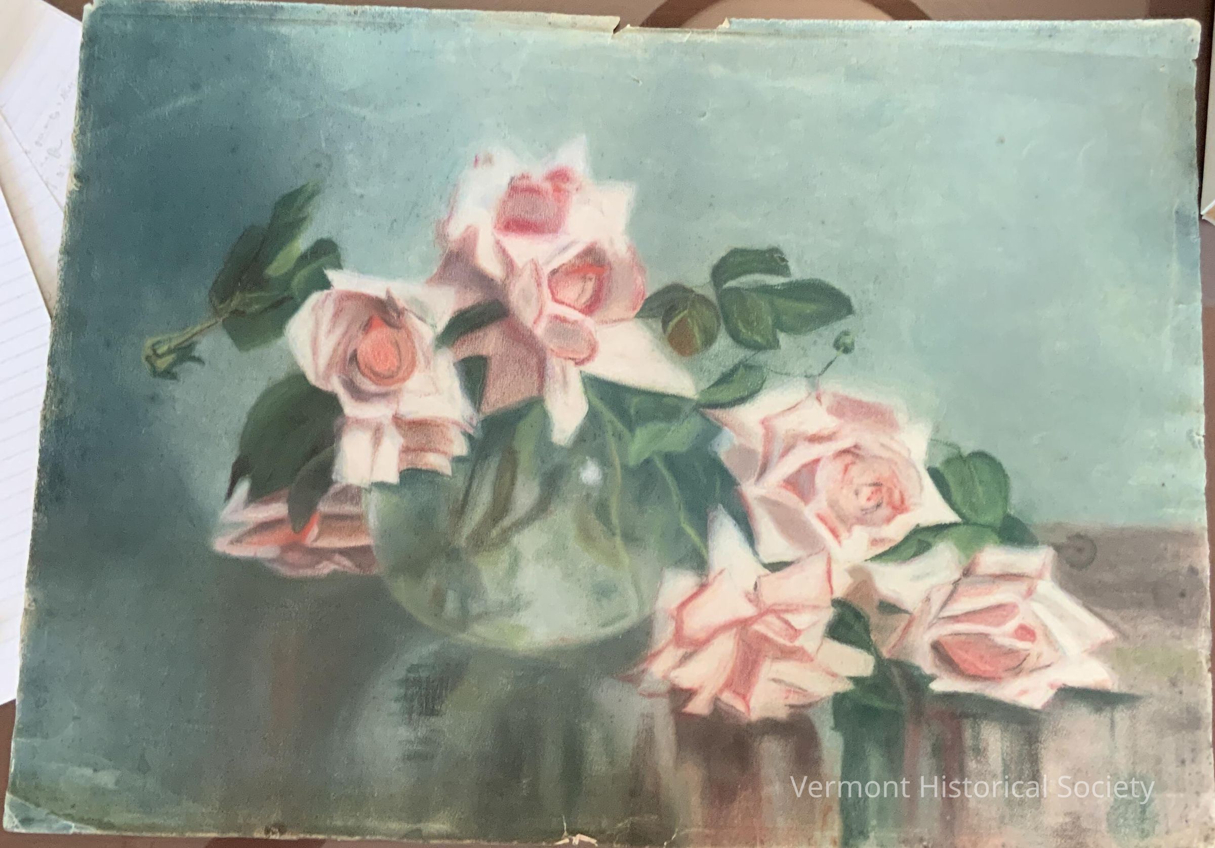 A painting of pink roses in a vase against a blue background. Unsigned and undated.Acquisition