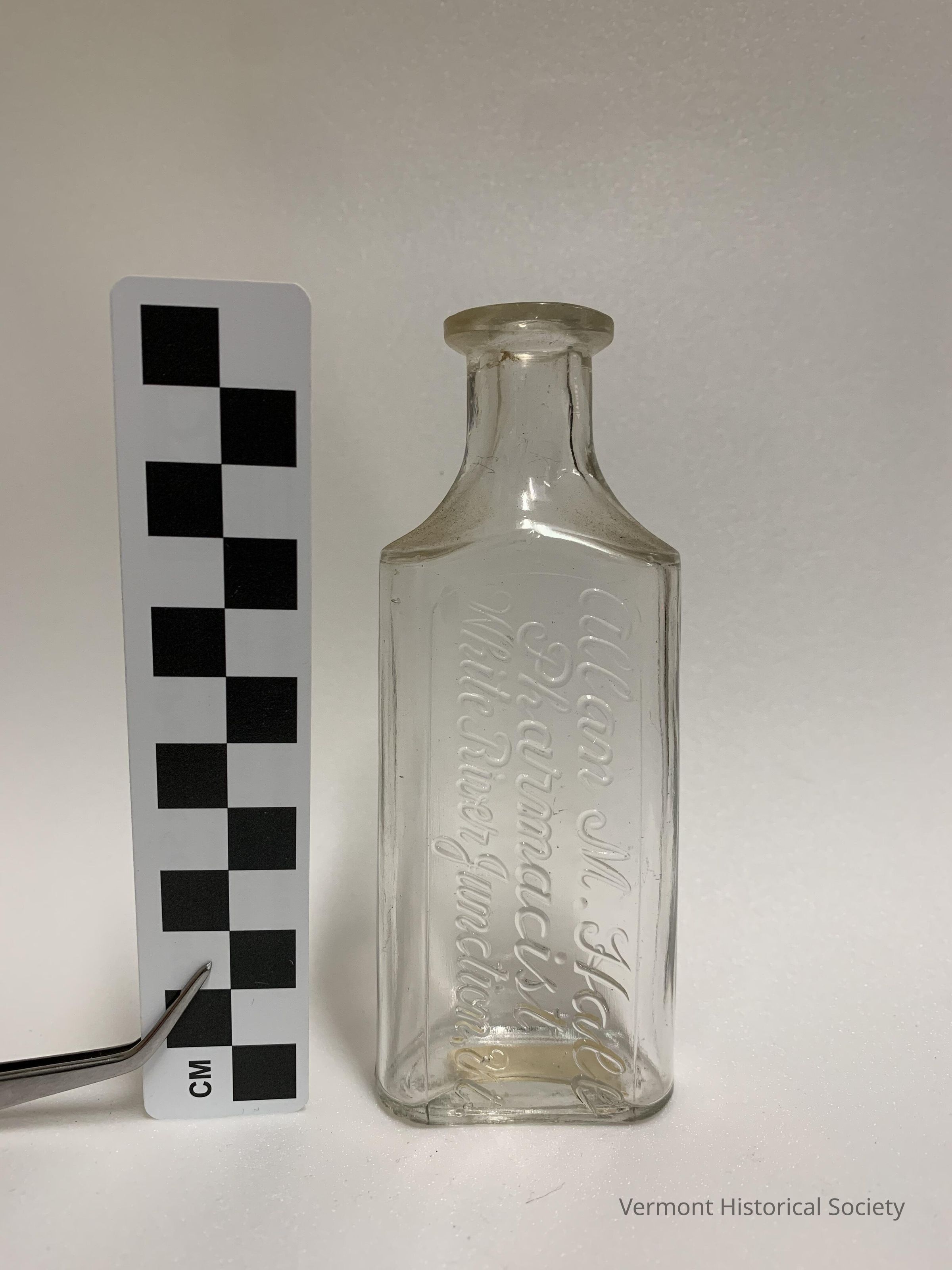 Clear, molded glass bottle bearing the molded inscription "Allan M. Hall/Pharmacist/White River Junctions, VT." on the face beneath a small, molded "3". The base also bears a molded inscription that is obscured by a paper sticker bearing the inked inscription, "4/26/24 / 1 /Srocken".