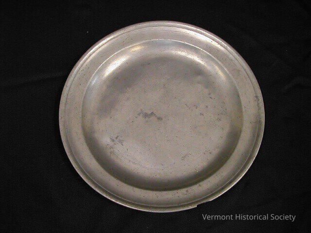 Large pewter plate. The rim is incised with a narrow line all the way around the edge.