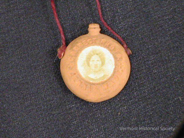 Miniature terracotta canteen impressed on one side with the inscription, "The only lady killed at Gettysburg. July 2, 63." The other side has a photographic print of a woman with dark hair surrounded by the impressed inscription, "Correct photo Jennie Wade".Context