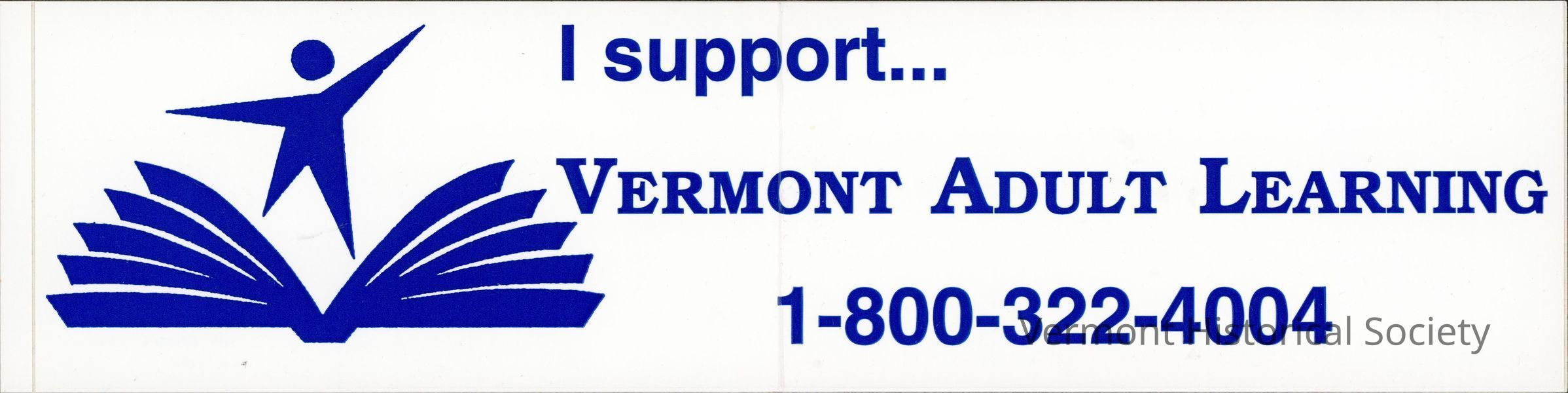 Bumper sticker with text "I support...VERMONT ADULT LEARNING 1-800-322-4004" in blue text on a white background. There is also a stylized design of a person leaping out of an open book, also in blue on white background.