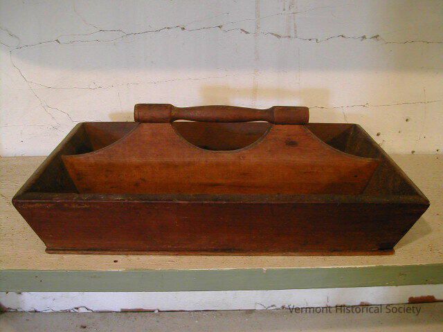 Rectangular wooden flatware tray with flared sides. The tray is separated into two sections by a central divider with a turned wooden handle at the center top.