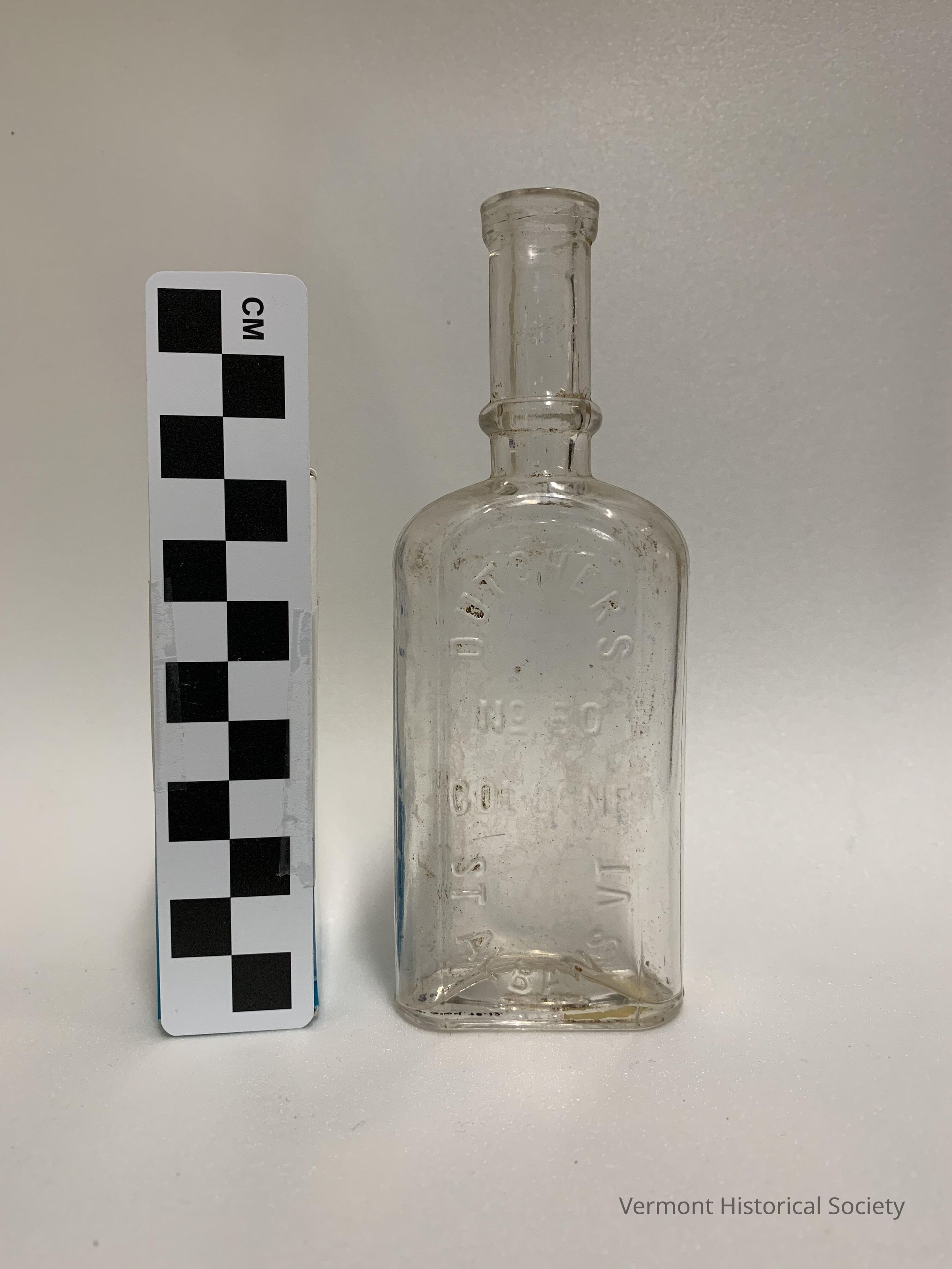 Clear, molded glass bottle with elongated neck and concase reverse. The face bears the molded inscription, " DUTCHERS/NO 50/COLOGNE/ST. ALBANS VT". The base bears the molded inscription, "918" and a paper sticker with the penciled inscription, "$3.00".