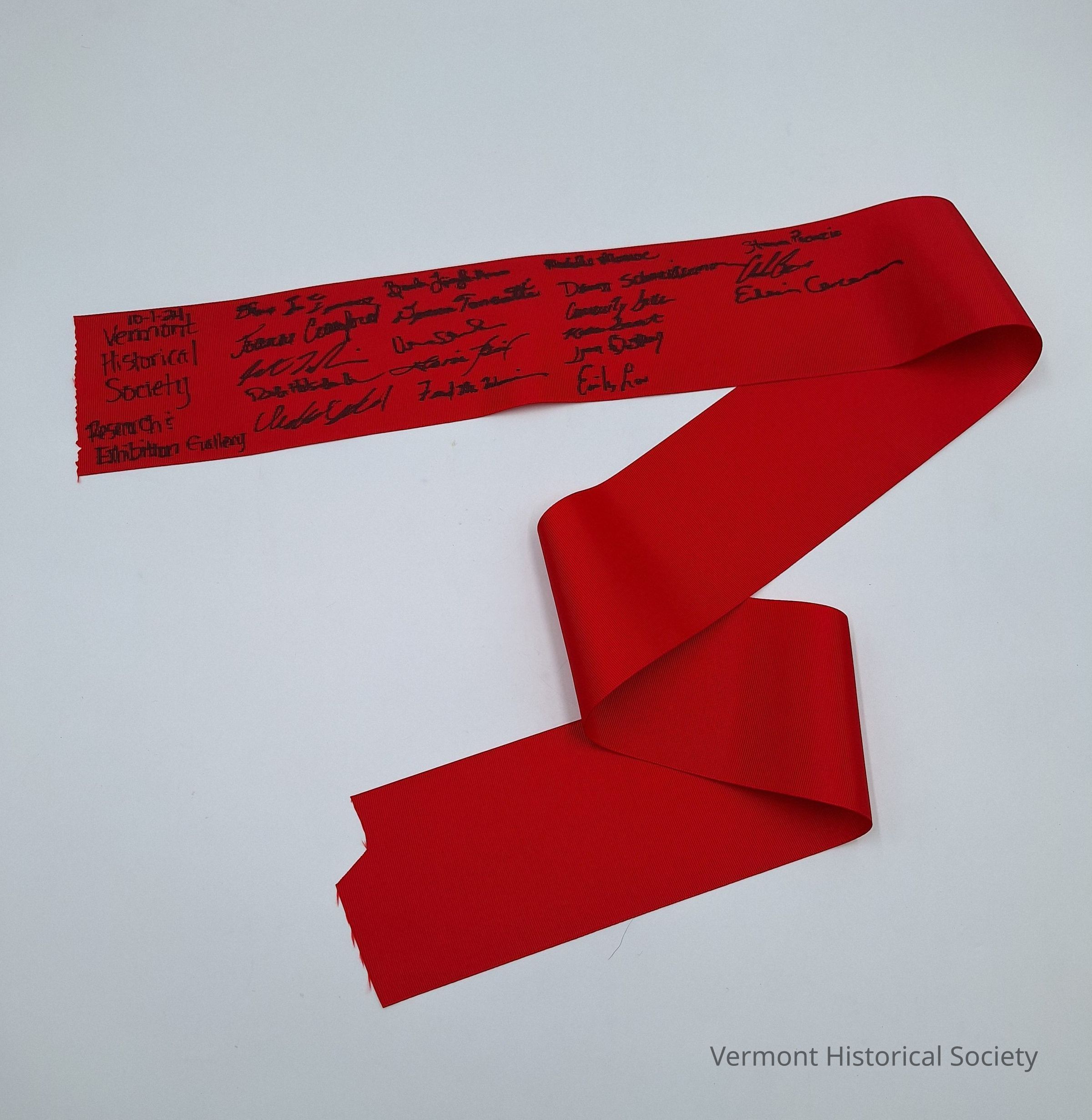 Polyester grosgrain ribbon. The red ribbon is a wide band and solid red. One end is inscribed, "10-1-24 / Vermont / Historical / Society / Research & / Exhibition Gallery" in black sharpie and signed by nineteen individuals in four rows beside the inscription.Context