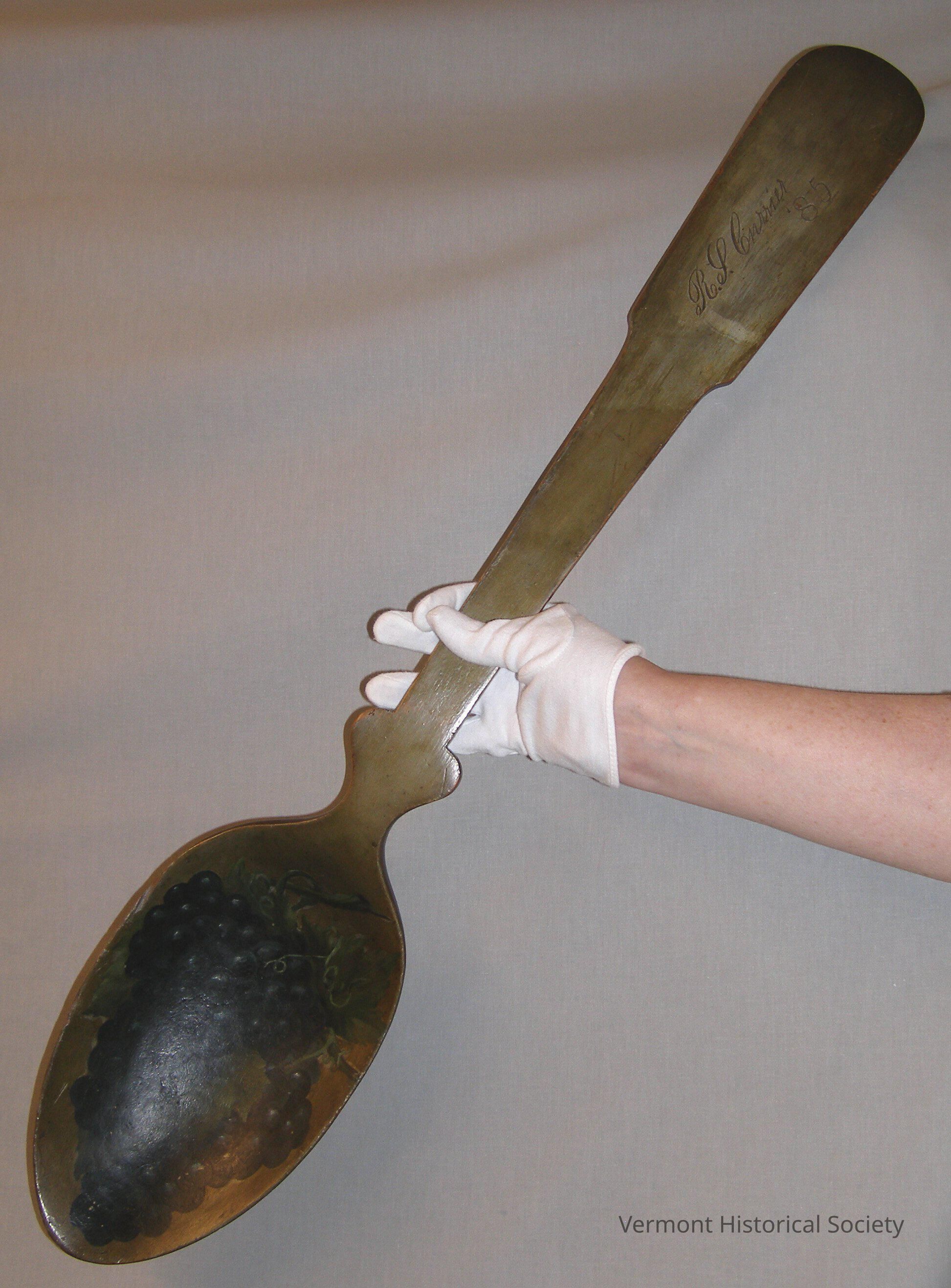 Large, decorative wooden spoon. The pine spoon is stained dark olive green with gold tones. The handle of the spoon is carved with the inscription, "R. S. Currier '85". The bowl of the spoon is hand painted with a bunch of dark purple grapes with attached vines and leaves.Context