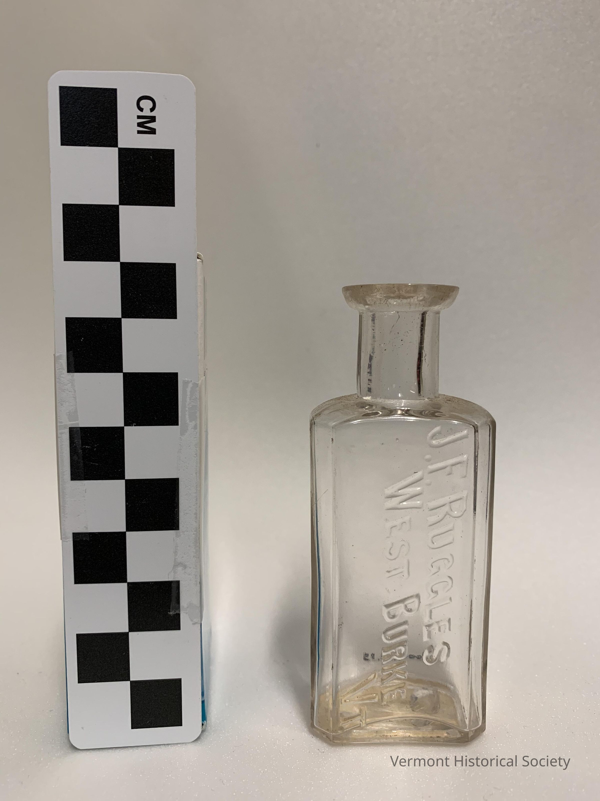 Small, clear, molded glass bottle bearing the molded inscription, "J. F. RUGGLES/WEST BURKE/VT" on the face. A paper sticker on the base bears the inscription, "5/10/71 / keping & / Morrisville / 150"