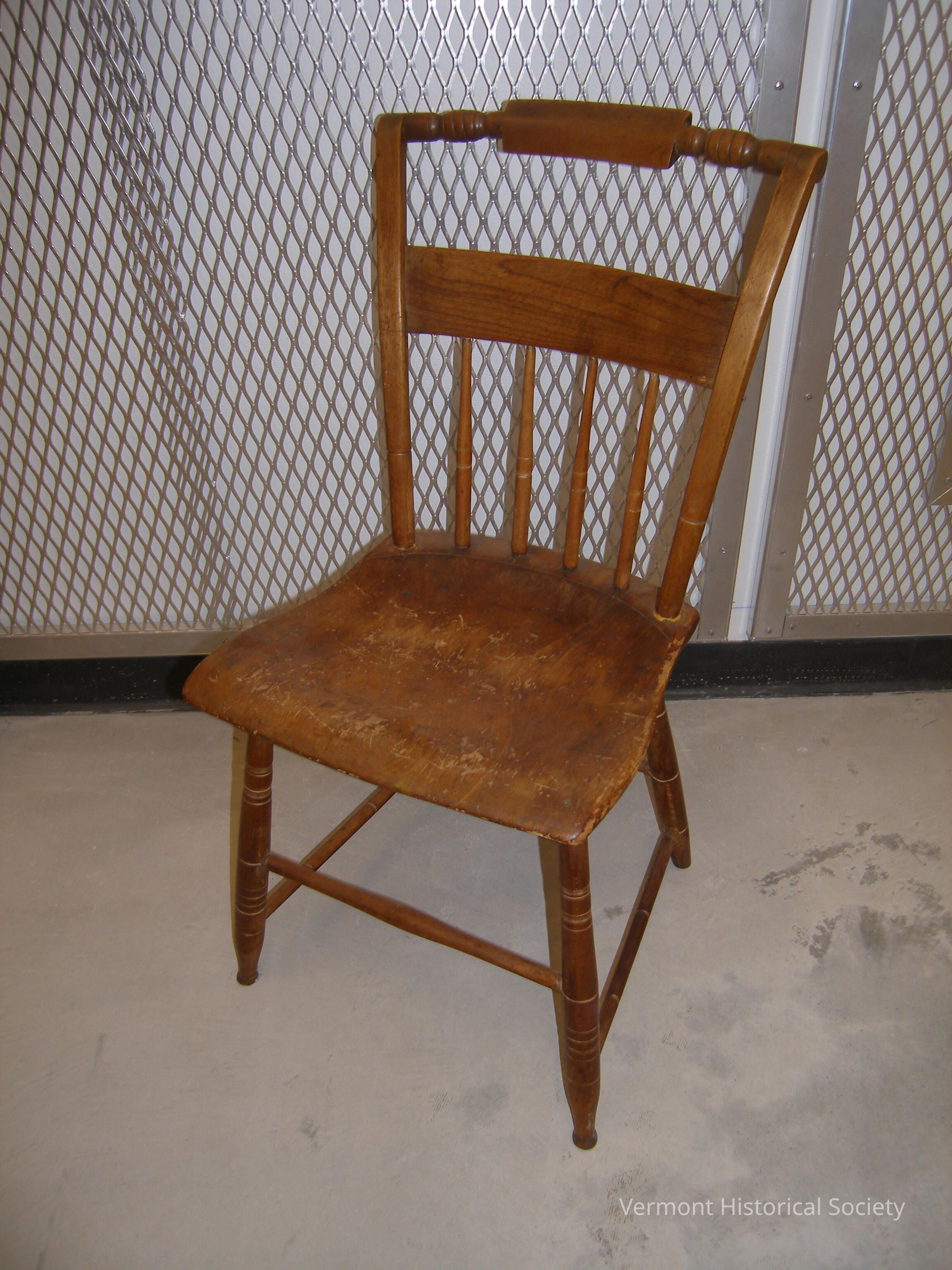 Wooden chair with plank seat. The back has a turned rail at the top, a flat rail in the middle, and 4 spindles between the lower rail and the seat. The legs are turned and connected by stretchers on all four sides. It is burned with the mark, "SI", on the bottom of the seat, and the letters "C.F." are painted in white on the bottom of the seat.Context