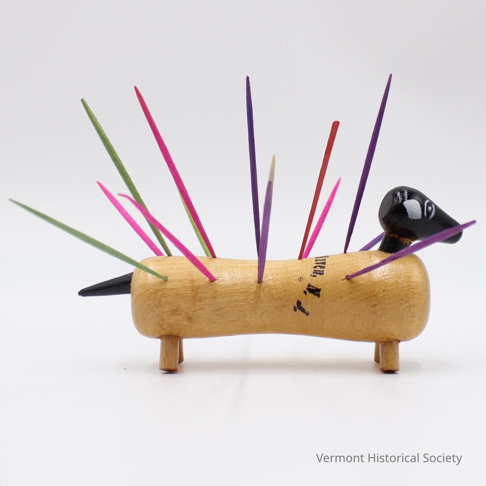 Toothpick holding in the shape of an animal. The animal has a long, turned body printed with the label, "New Haven, N. J." There are four pegs inserted into the bottom of the body for legs, and a black-painted tail and head. The head is printed in white with eyes and ears. 14 colored toothpicks accompany the holder and can be inserted into tiny holes scattered across the body. The set comes with its original, unmarked cardboard box with lid, and a wax paper pouch for the toothpicks.Context