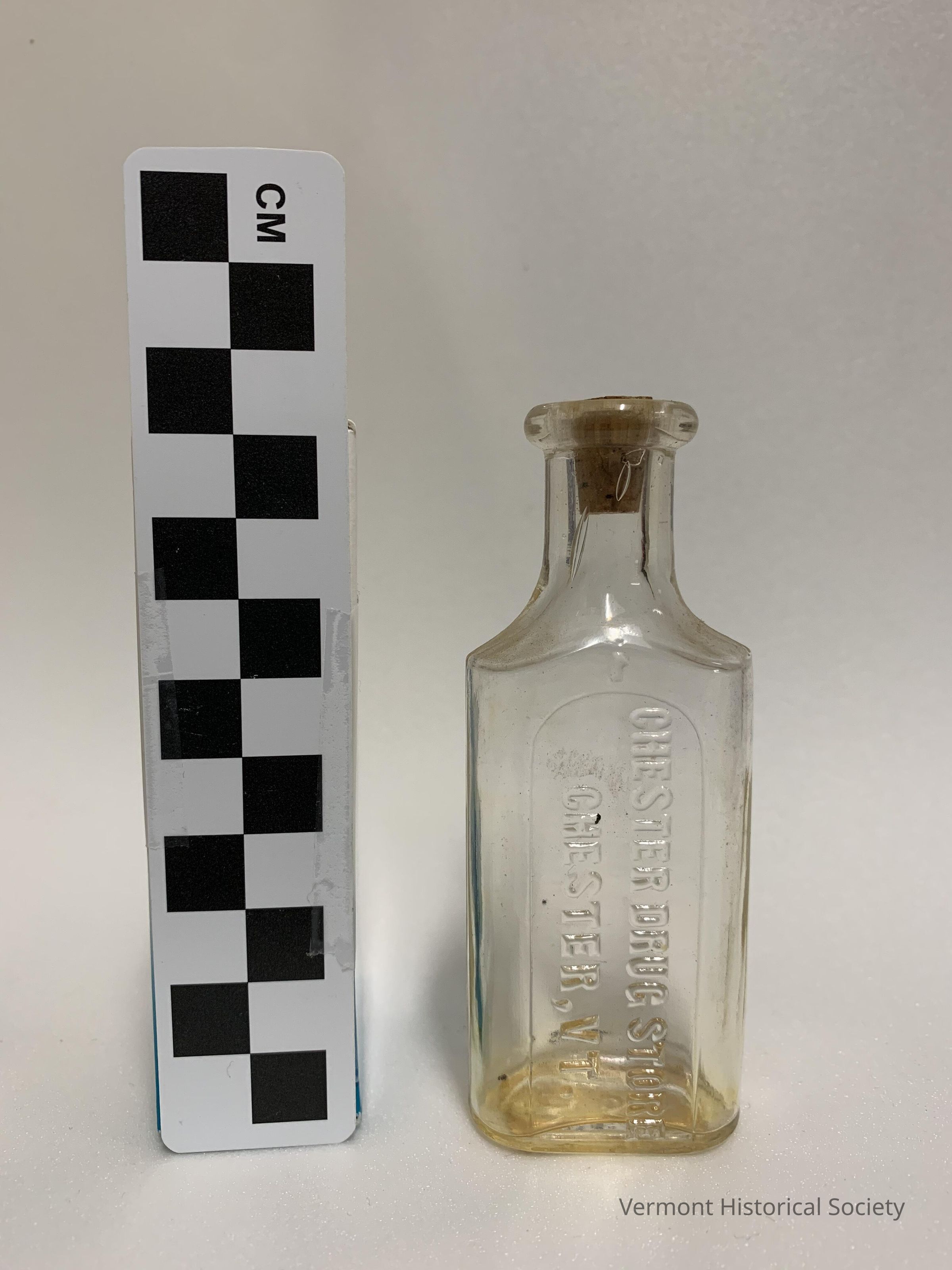 Small clear, molded glass bottle with the molded inscription, "CHESTER DRUG STORE/CHESTER, VT" under the molded inscription "1". The base of the bottle has a paper sticker bearing the inked inscription, "4/26/71 / 1 / Srocker". The bottle is slightly discolored with dried medicine on the interior base, and the original cork is still present.