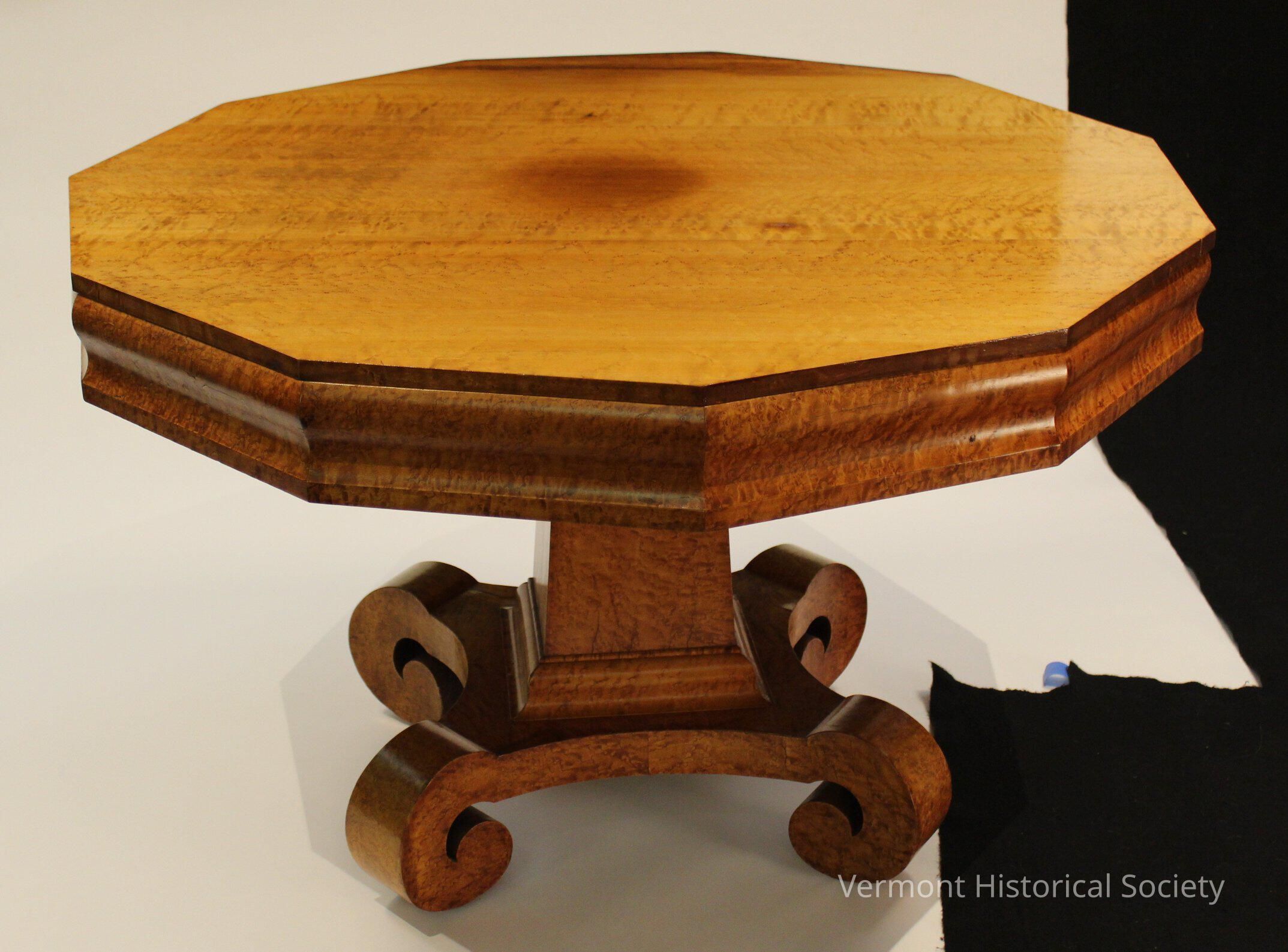 Empire style 11-sided center table of curly maple with a center pedestal base. There are 4 scrolled legs at each corner of the base.