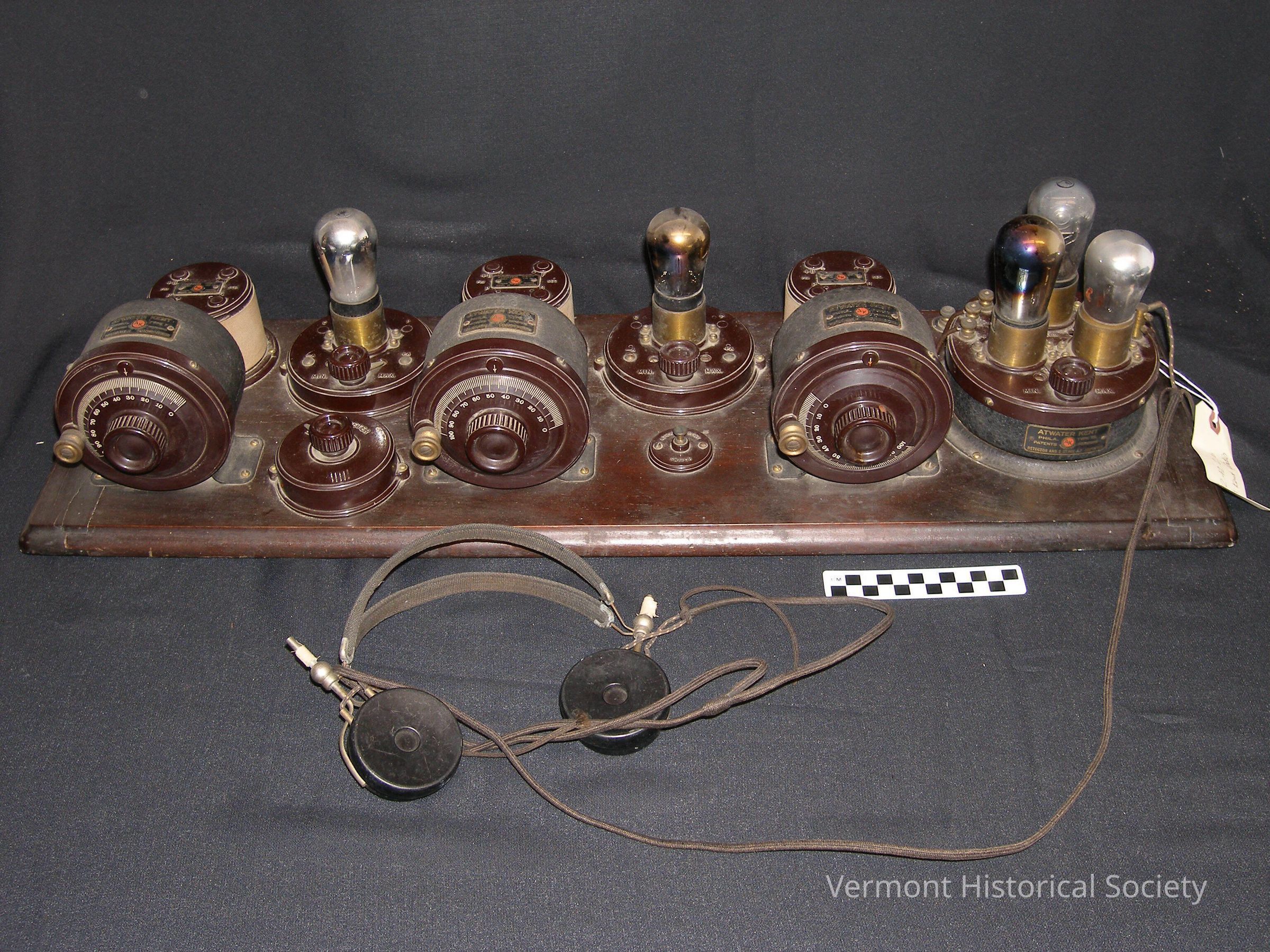Radio with exposed components attached to a wooden board. The components include three dials, each with a corresponding hub behind, and five vacuum tubes. Two of the tubes are between dials, and the other three are clustered into a hub at the right. A pair of headphones attaches with a brown wire to the vacuum tube hub.Context