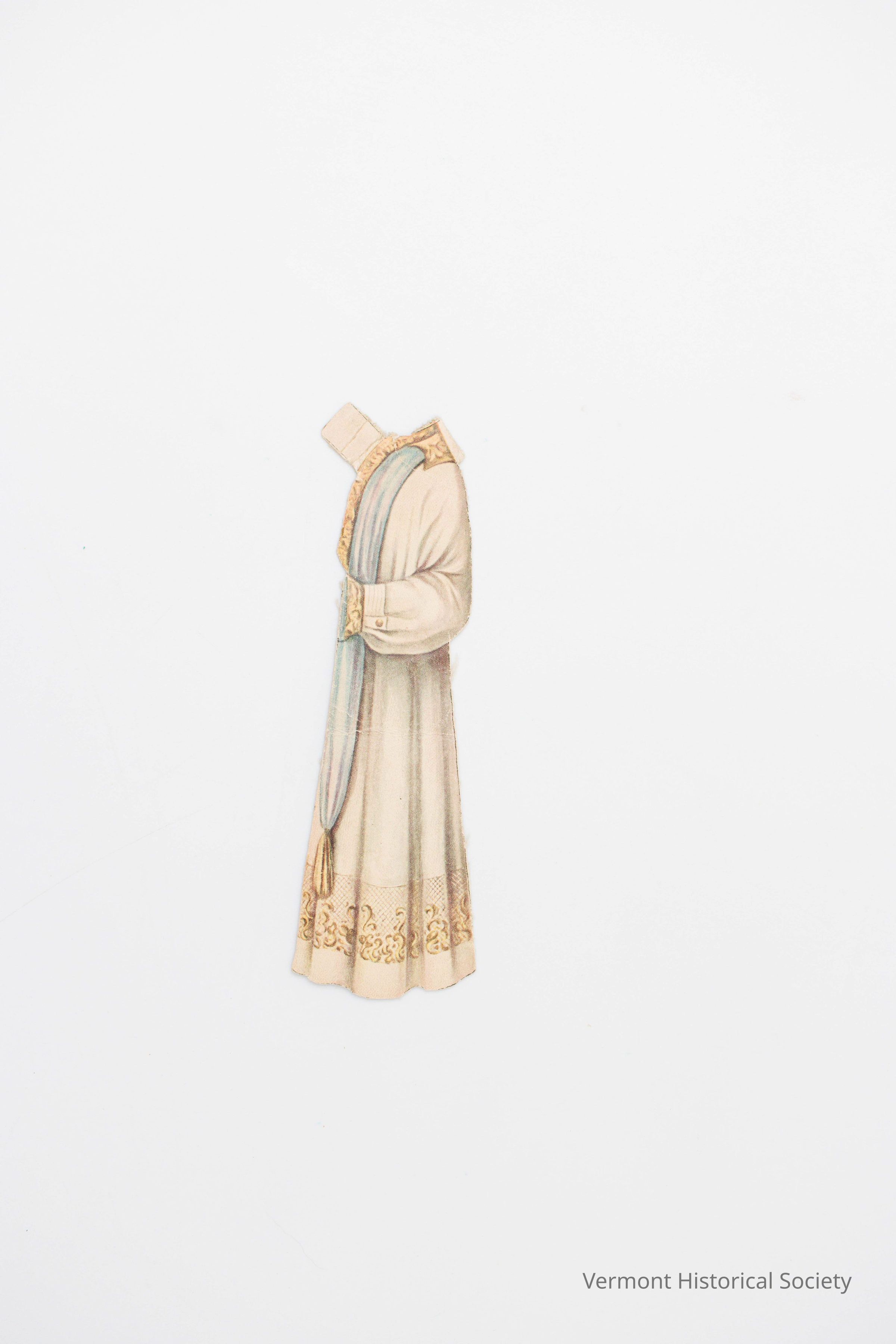 Edwardian-style white tea gown for a paper doll. It is seen from the side and has a light blue tassel down the front.Context