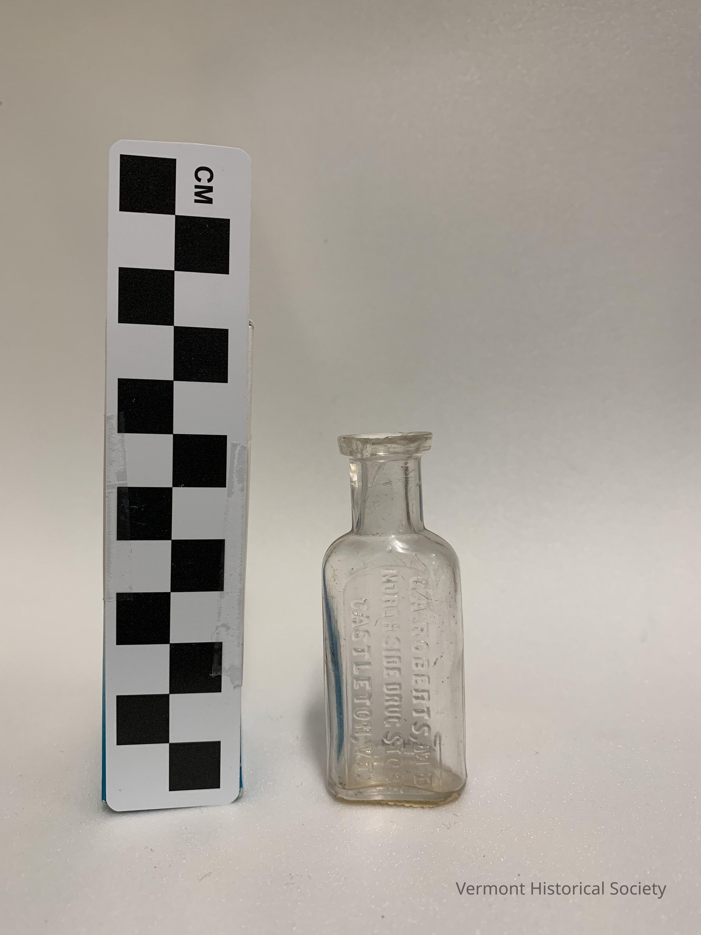 Small, clear molded glass bottle bearing the molded inscription, "G. A. ROBERTS, M.D./NORTH SIDE DRUG STORE/CASTLETON,VT." A paper sticker on the base bears the inked inscriptiong "7/9/71 / Srockir / 1--".