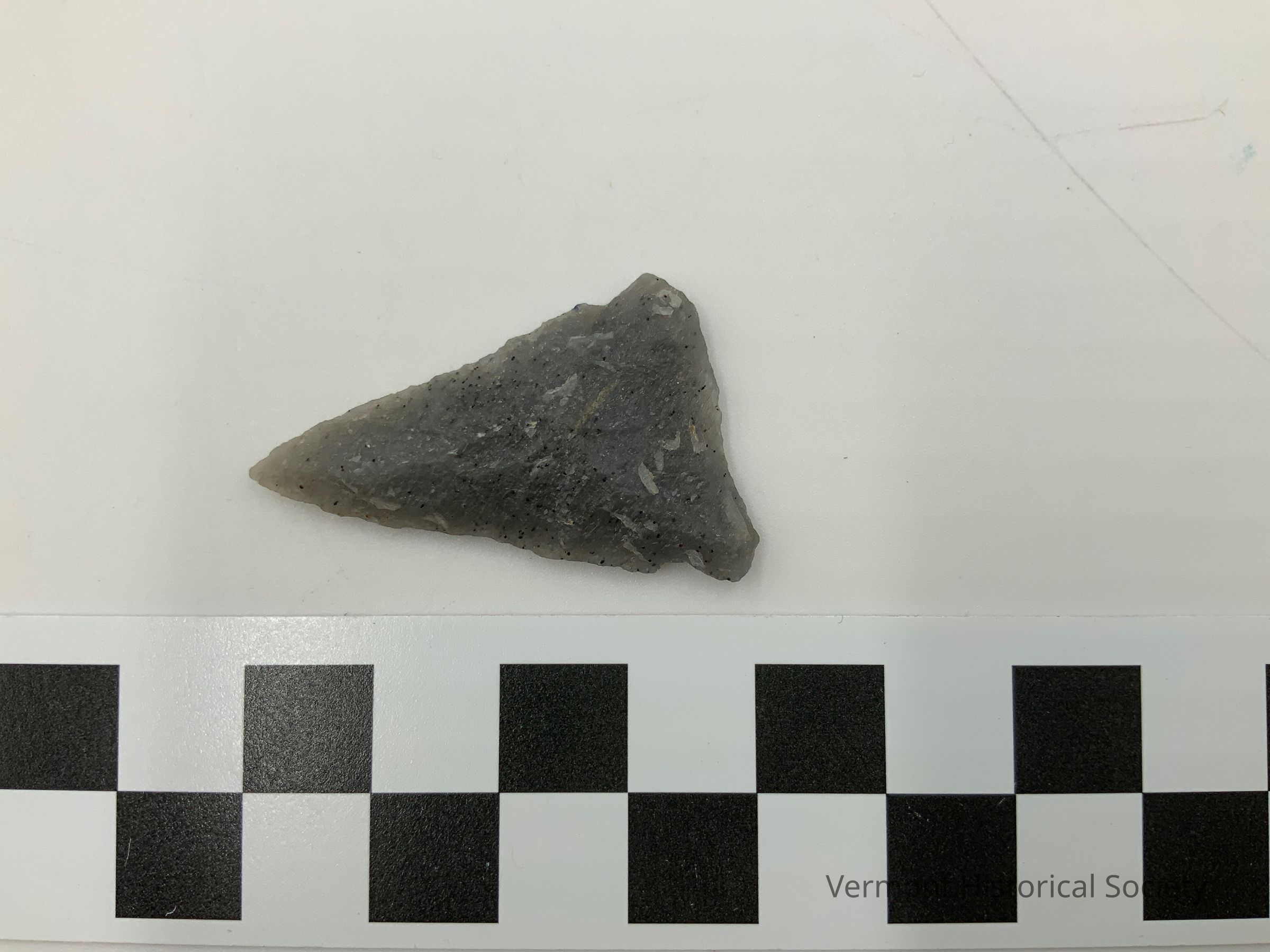 Triangular grey chipped stone projectile with small side notches. The blade edges are straight, and the base is thinned and straight.Context