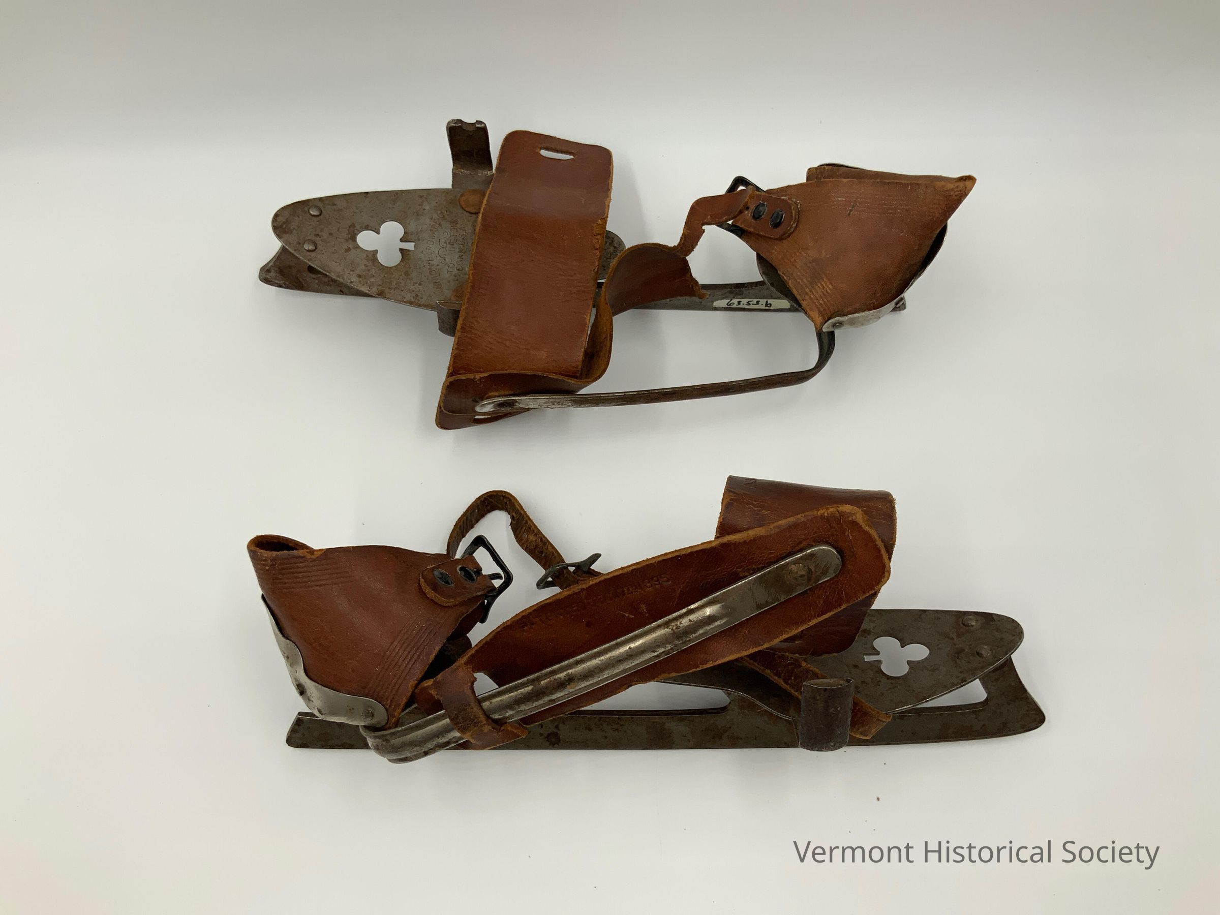 Metal clamp-on style ice skates. The skates consist of a toe plate, heel plate, blade, leather straps, and an adjustable metal side support. The toe plate is triangular with a clover punched out of the center. It is marked, "10 / UNION HARDWAR CO. TORRINGTON CONN.U.S.A." There is a metal bracket on either side of the toe plate even with the ball of the foot. Each bracket can be adjusted outward or inward with a bolt under the toe plate, making the fit wider or narrower. The heel plate is wrapped at the back with a foliated metal heel support and leather strap that wraps around the back of the heel. There is a long, L-shaped bracket extending from one side of the heel plate. The bracket is fitted with an oval leather strap and is adjustable in height from the connection point. The strap is impressed, "PATENTED DEC. 17TH 1895". The toe and heel plates are connected to the blade and are not adjustable. The blade is narrow, but no longer sharp.Context