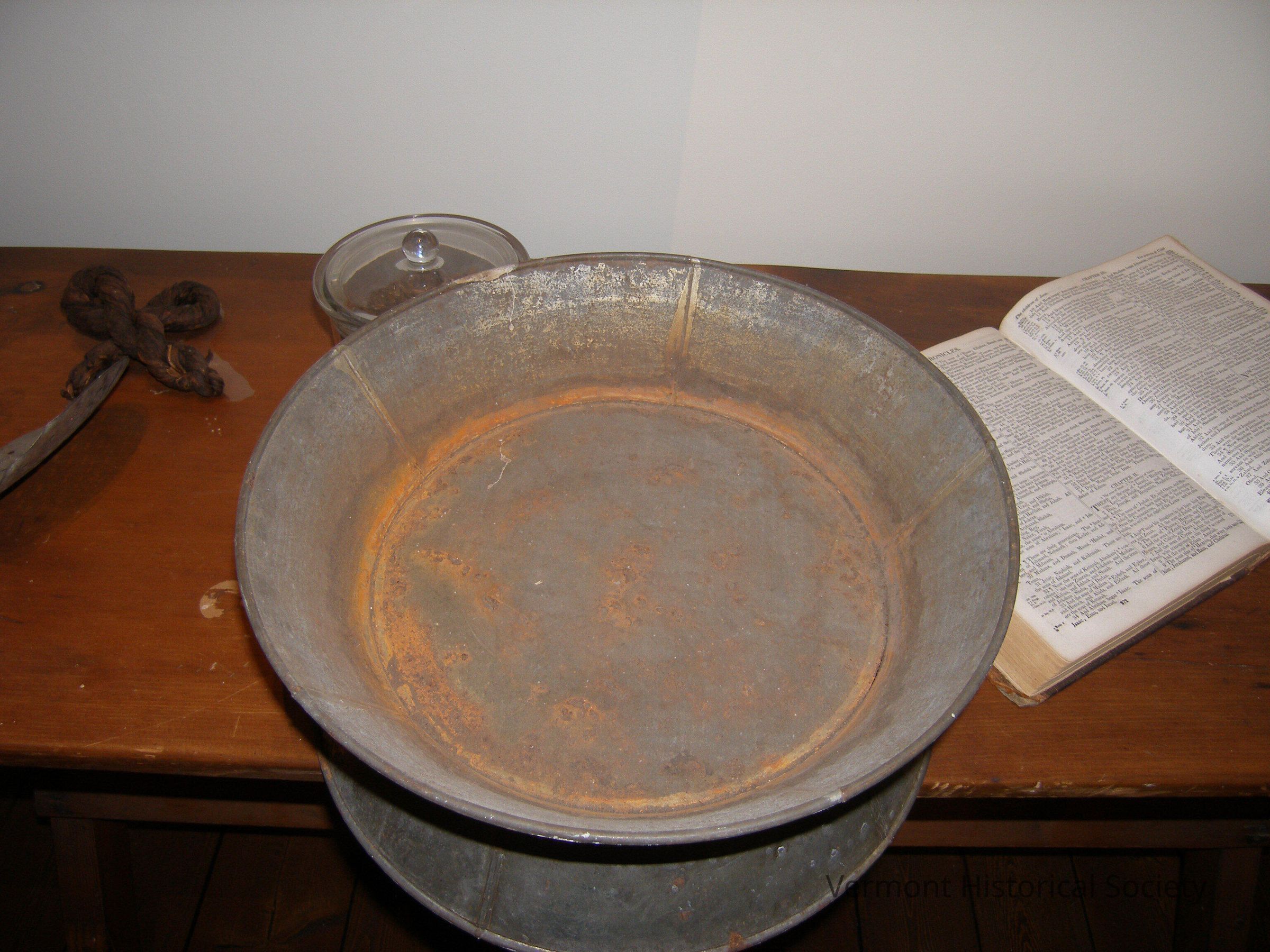 Round milk settling pan with with flared sides. The sides are pieced from five sheets.
