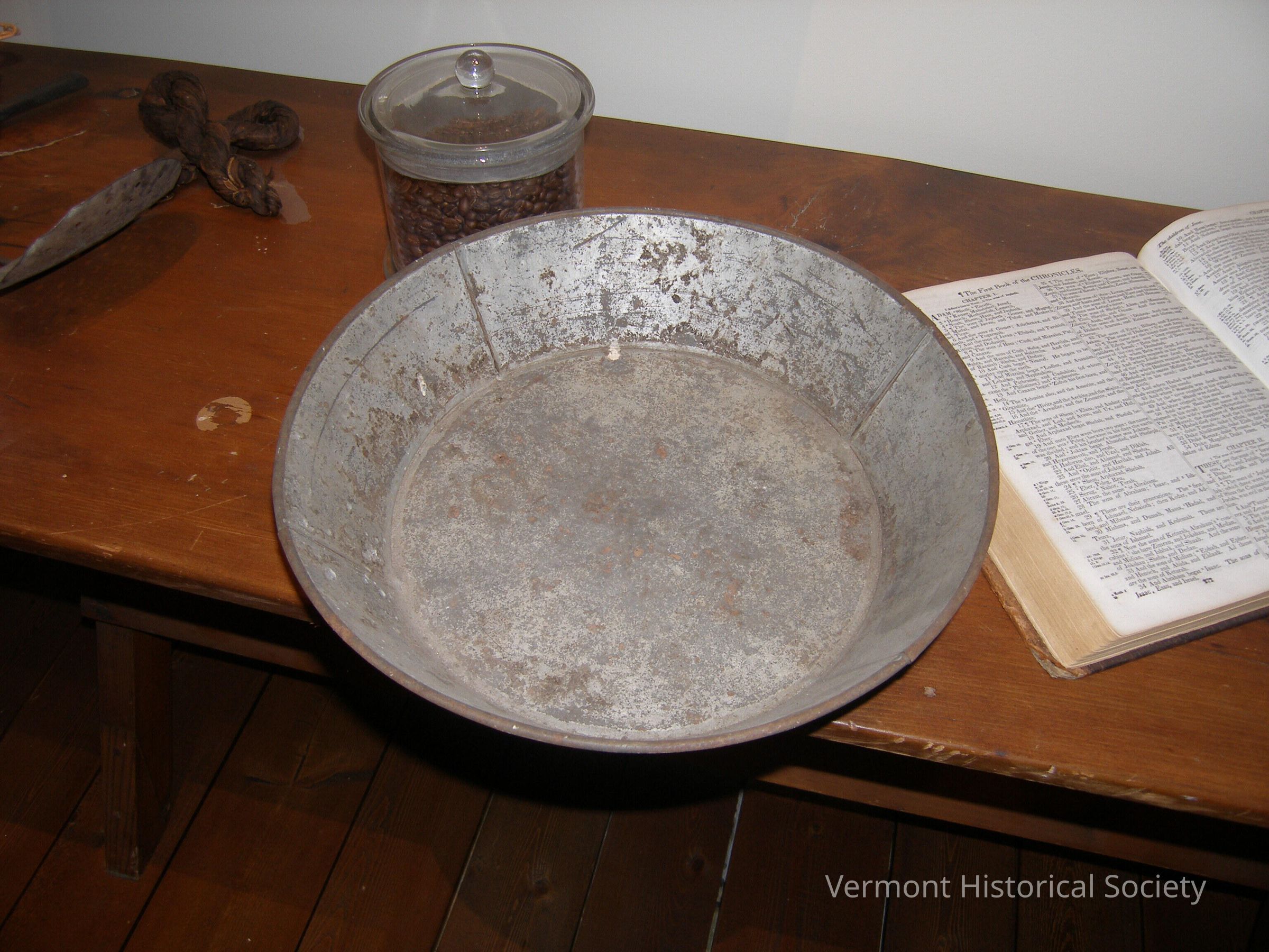 Round milk settling pan with with flared sides. The sides are pieced from four sheets.