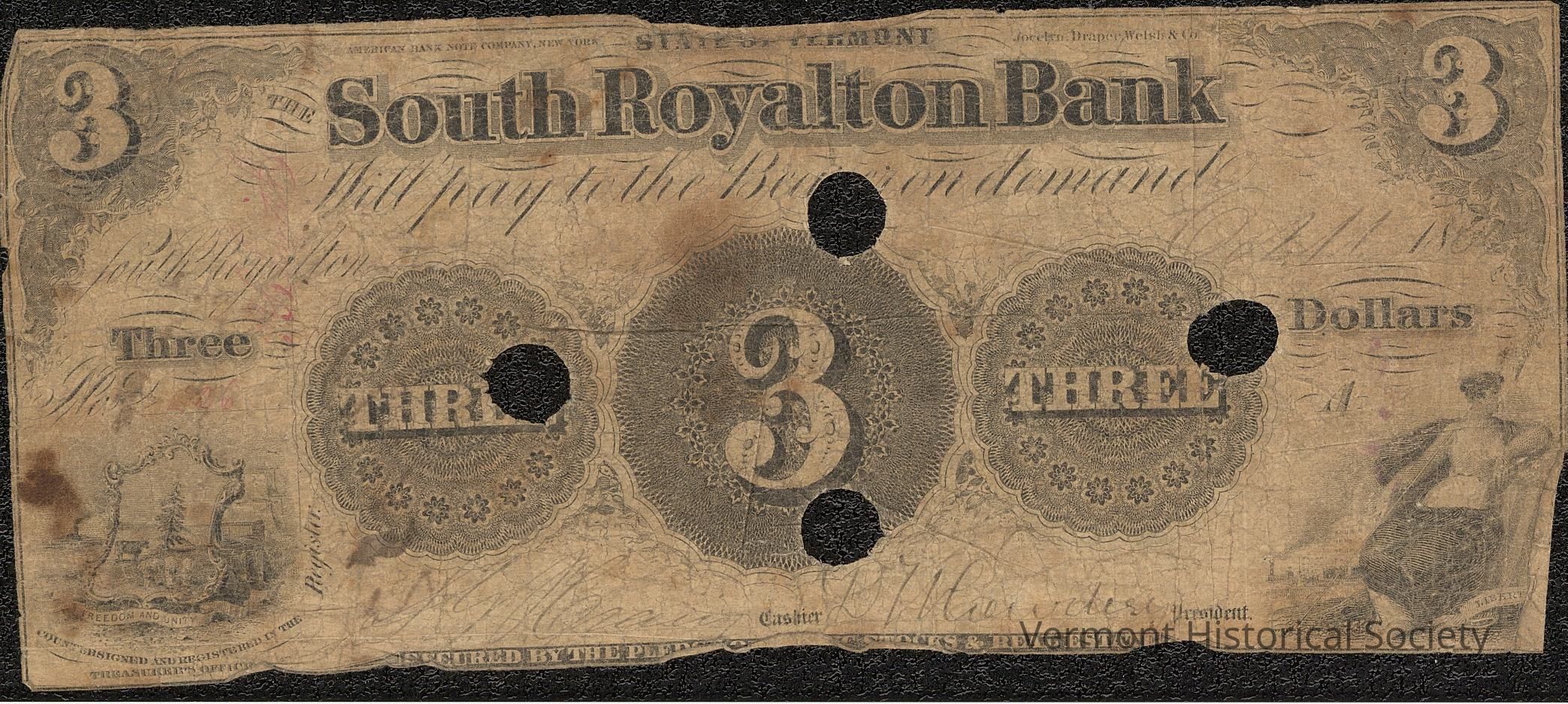 Private bank note for 3 dollars issued by The South Royalton Bank. There are 4 round holes evenly spaced in a diamond shape at the center. It is printed with the number 3 in various forms throughout, along with the Vermont state seal (lower left) and an allegorical woman (lower right). It has the inscritpion, "AMERICAN BANK NOTE COMPANY, NEW YORK / STATE OF VERMONT / JOSCELYN, DRAPER, WELSH & CO. / THE South Royalton Bank Will pay to the Bearer on demand."Context