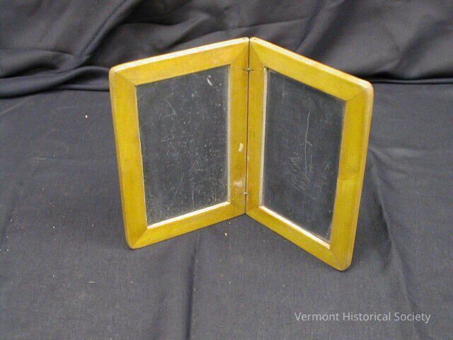Two small wood-framed writing slates connected along one side with wire hinges.