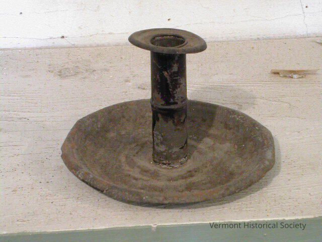 Sheet metal chamberstick consisting of a wide round base and tall candleholder. There is a lever on the side of the candleholder to adjust height.