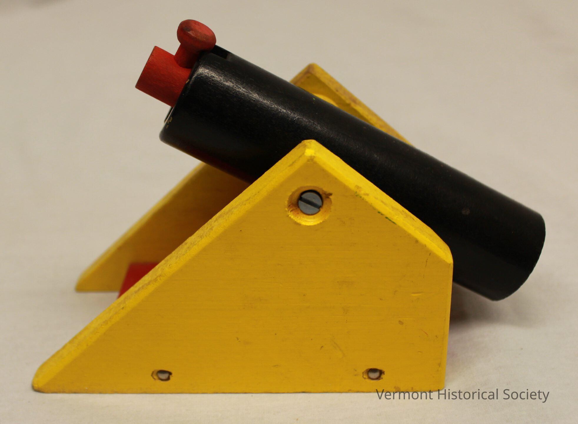 Painted wood toy cannon. The cannon is black with a hole drilled through the center. One end of the hole is plugged with a red dowel with a peg at the top. The cannon is attached to a red and yellow base so that it swivels. There are also two yellow disks and a red peg with the toy, whose uses are unclear. The bottom of the base is signed "J. P. D" in a child's handwriting.Context
