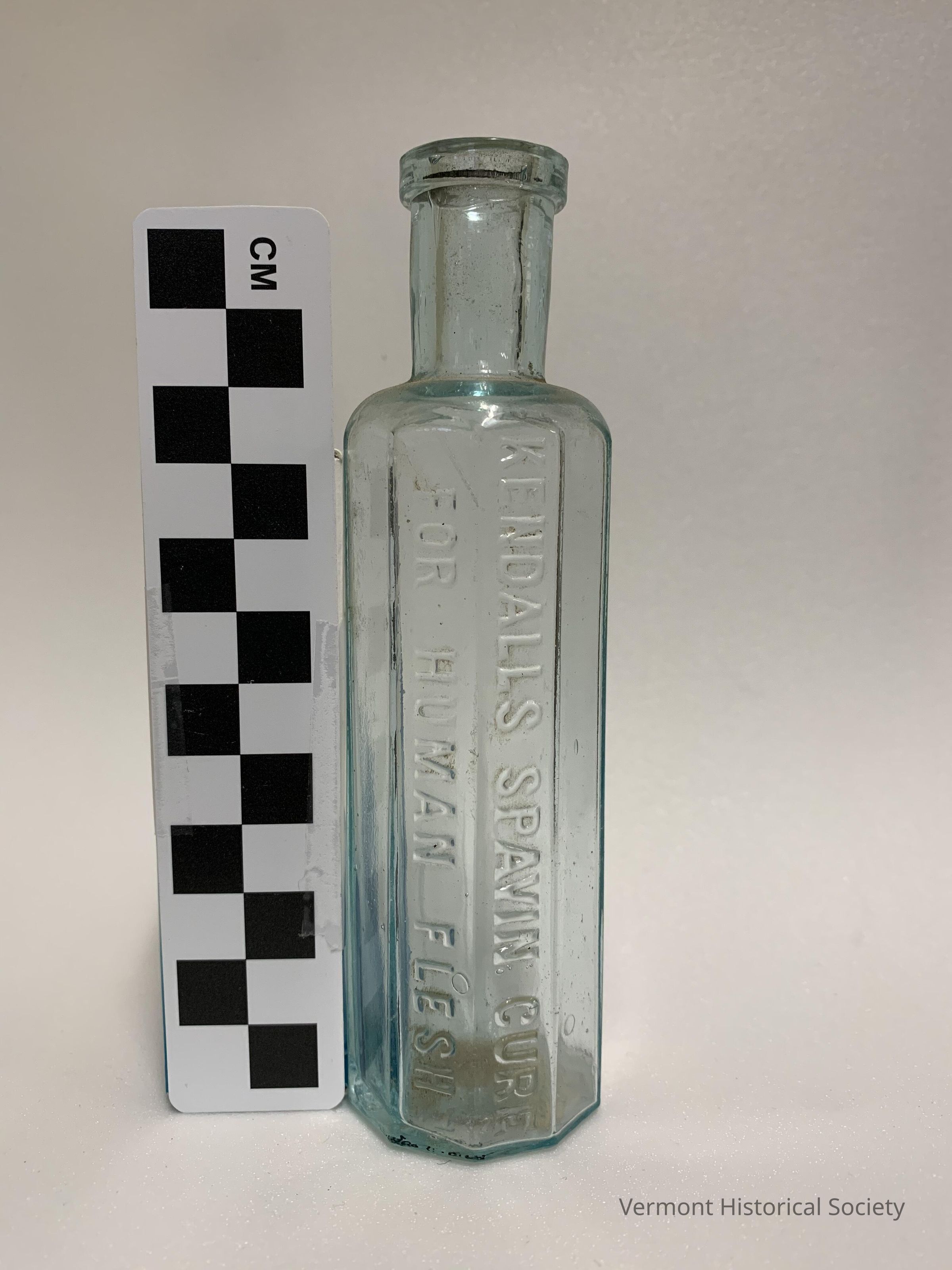 10-sided, molded green glass bottle bearing the molded inscription "KENDALLS SPAVIN CURE/FOR HUMAN FLESH". The base also bears a molded inscription that is mostly obscured. "URGH . . . V.T." is visible. A paper sticker on the base bears the inked inscription, "3/20/79 / Srocker / 2."