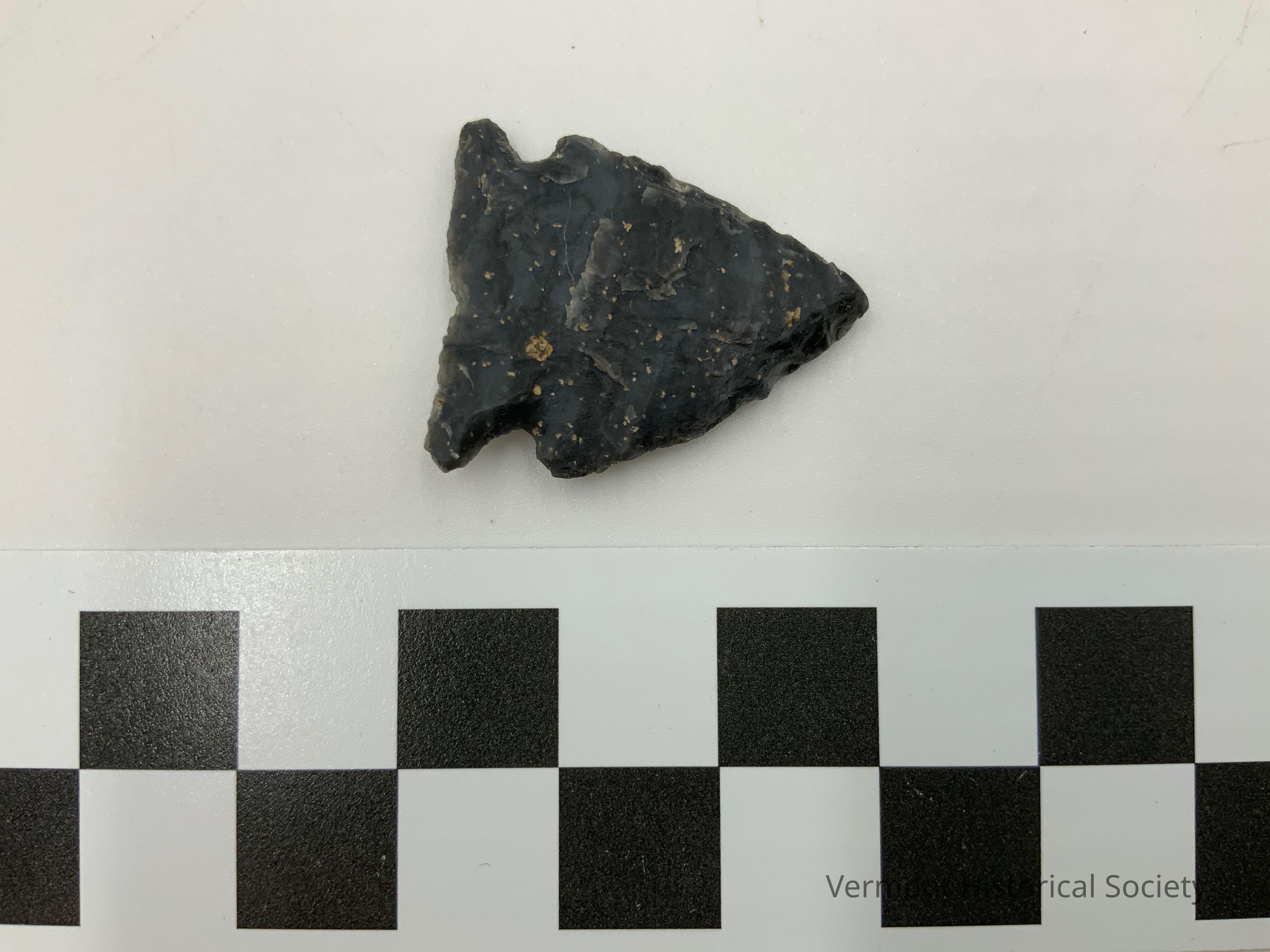 Small grey chipped stone projectile point with side notches. The blades are formed by secondary chipping on both faces. The base is straight and thinned.