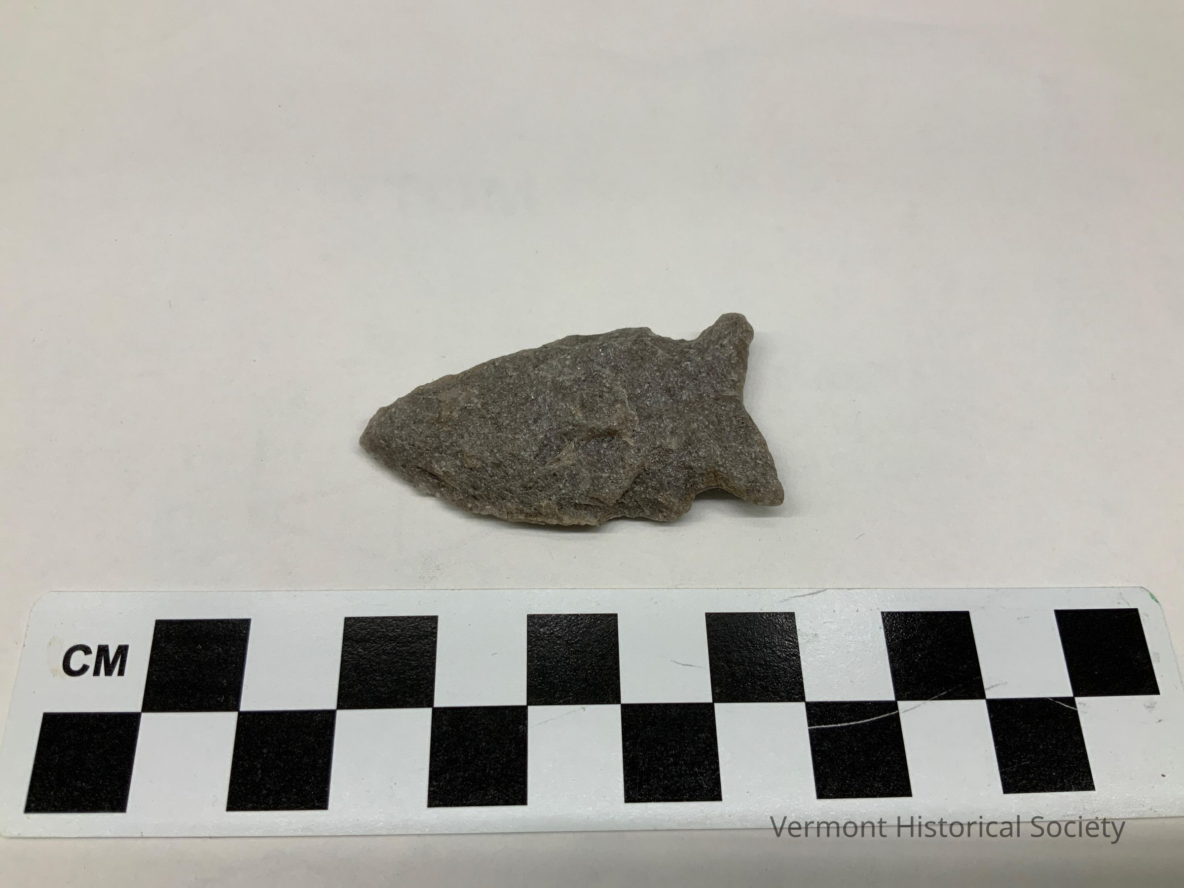 Gray chipped stone projectile point with side notches. The base curves inward in a V-shape, and the blade edges curves outward.Context